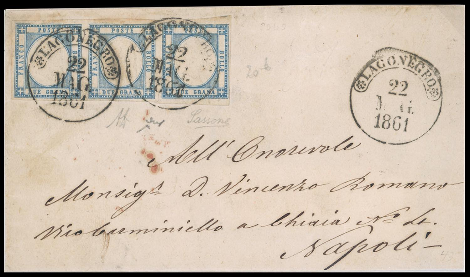 1861 - 2 grana azzurro chiaro, striscia orizzontale di tre, principio di filetto di inquadratura in alto su tutti gli esemplari (20k), perfetta, su lettera da Lagonegro 22/5/1861 a Napoli. A.Diena, Sassone, Chiavarello.
