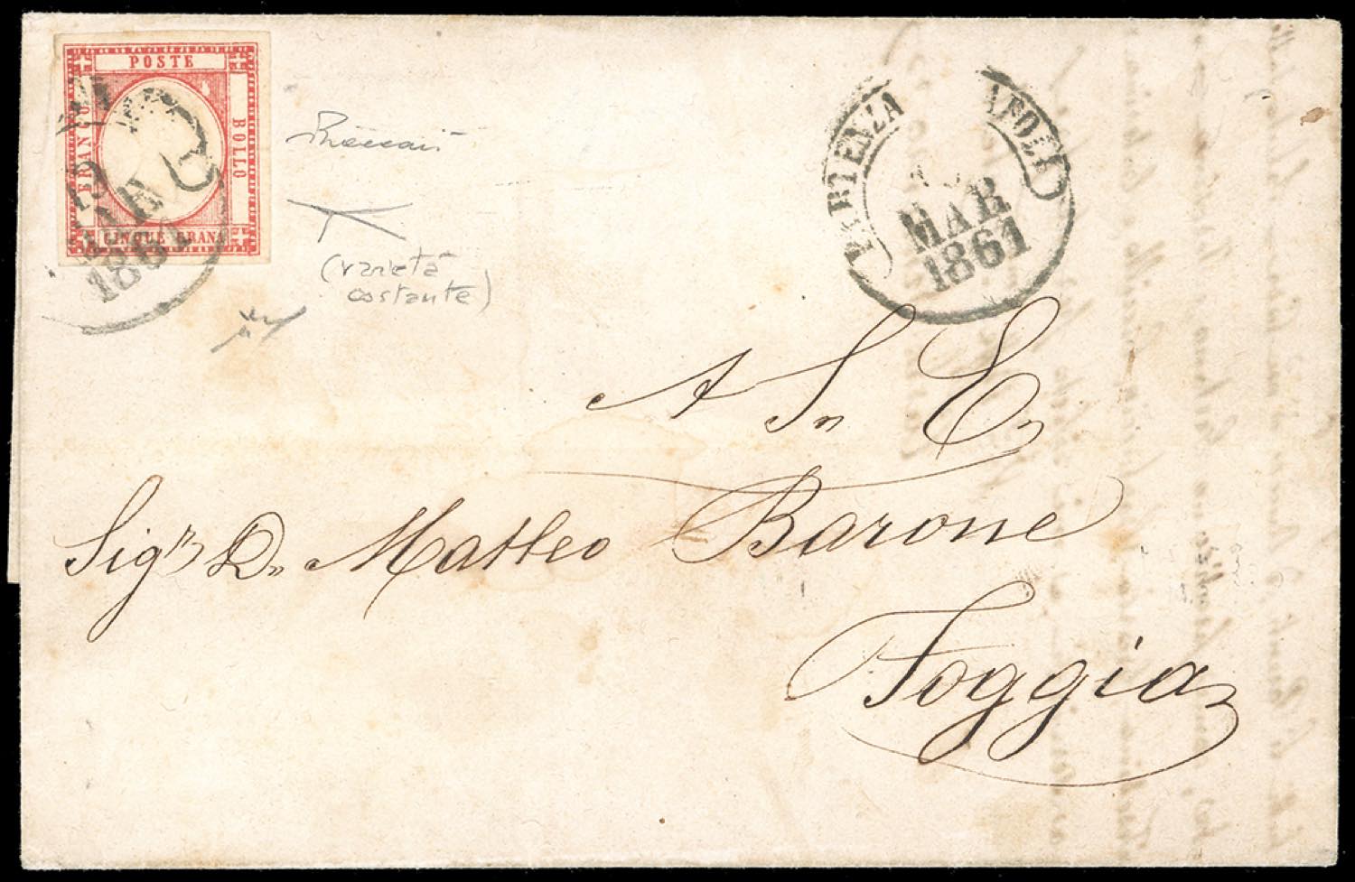 1861 - 5 grana rosso carminio (21), evidente varietà costante di clichè, perfetto, su lettera da Napoli 19/3/1861 a Foggia. Bottacchi, ... Read more