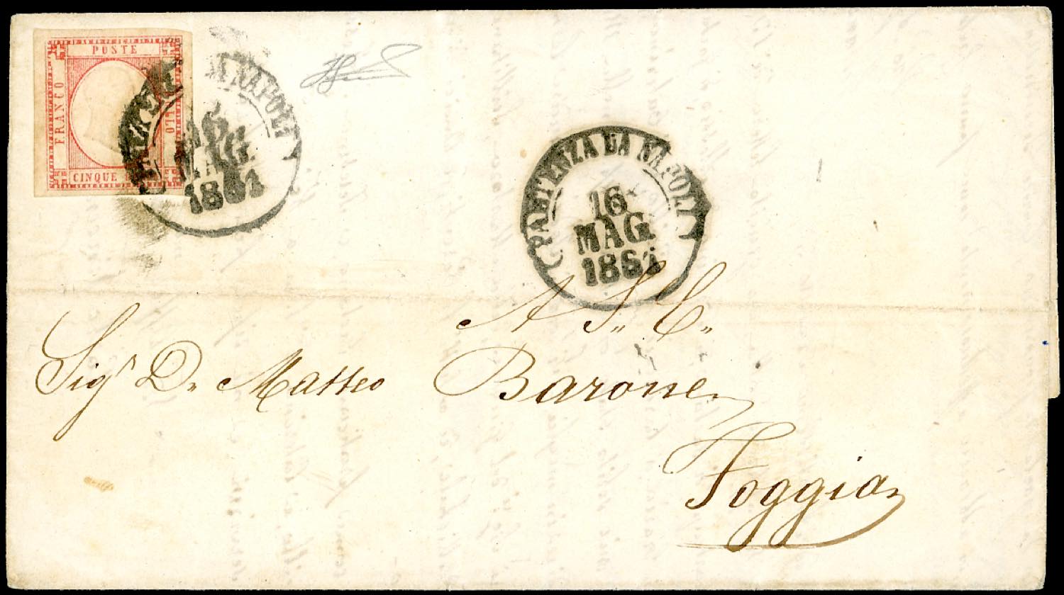 1861 - 5 grana rosso carminio (21), interessante varietà di stampa in alto a sinistra, perfetto, su lettera da Napoli 16/5/1861 a Foggia. ... Read more