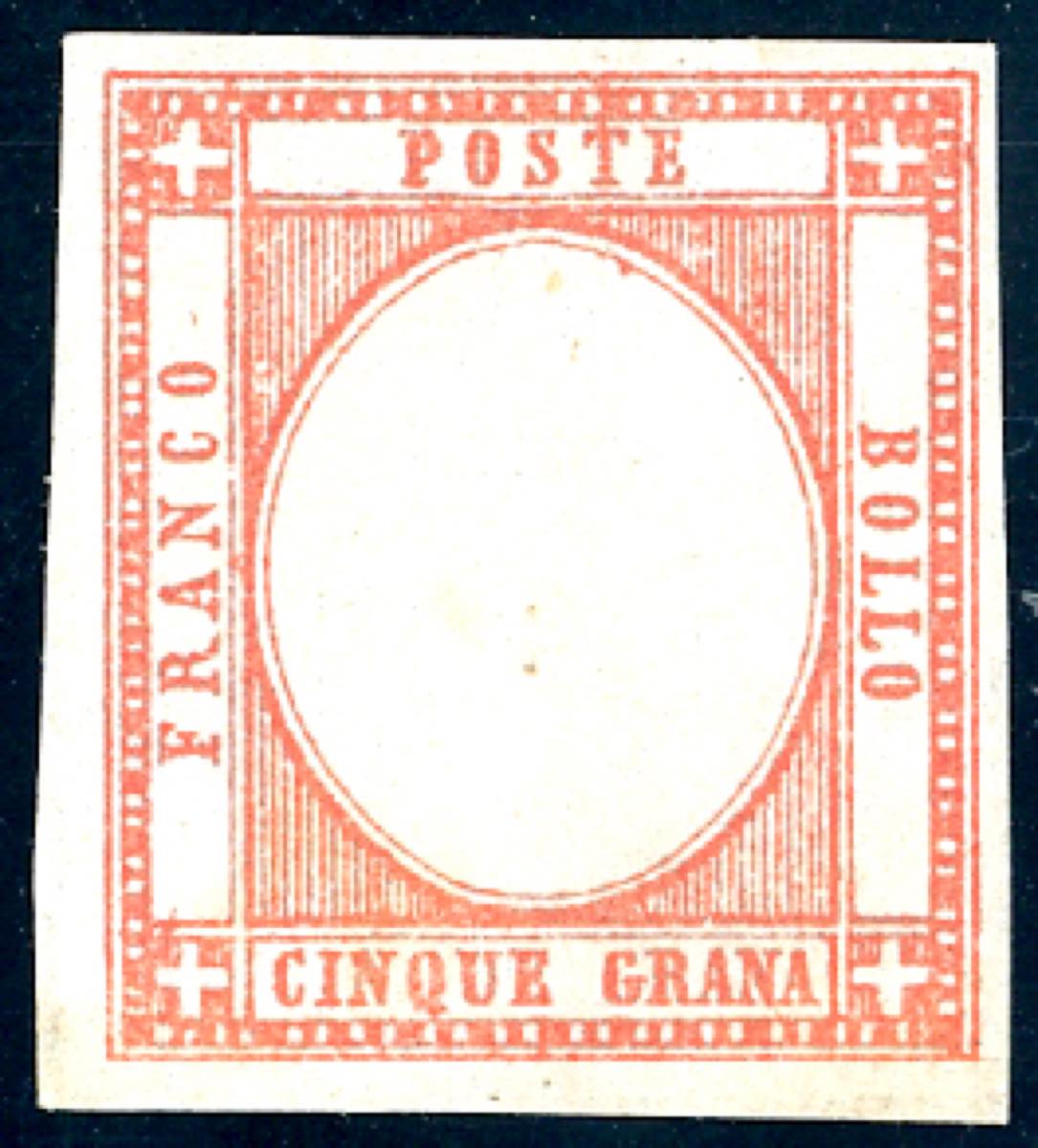 1861 - 5 grana vermiglio (21a), senza effigie, gomma originale, leggera traccia di linguella, perfetto. Varietà non catalogata per questo ... Read more
