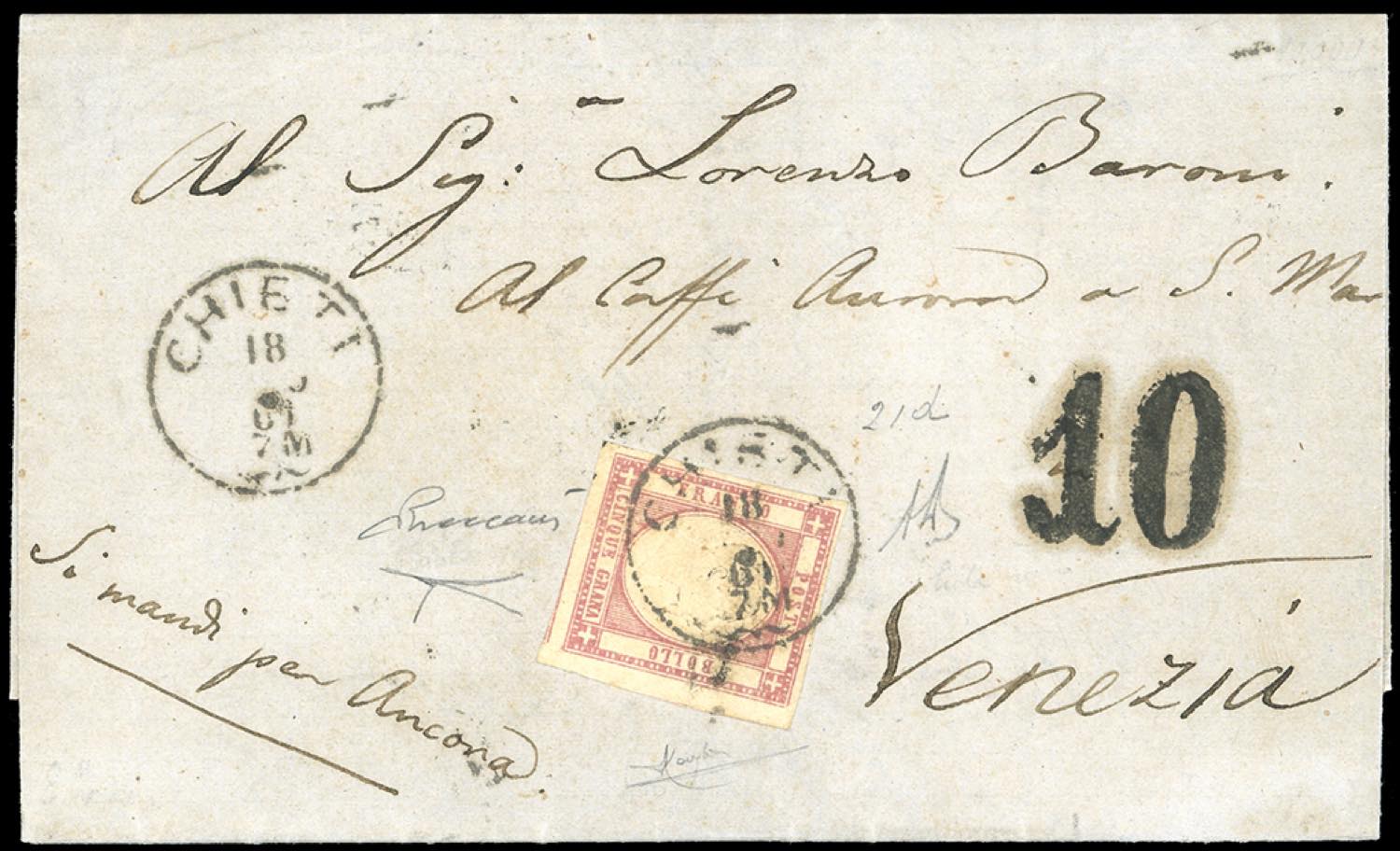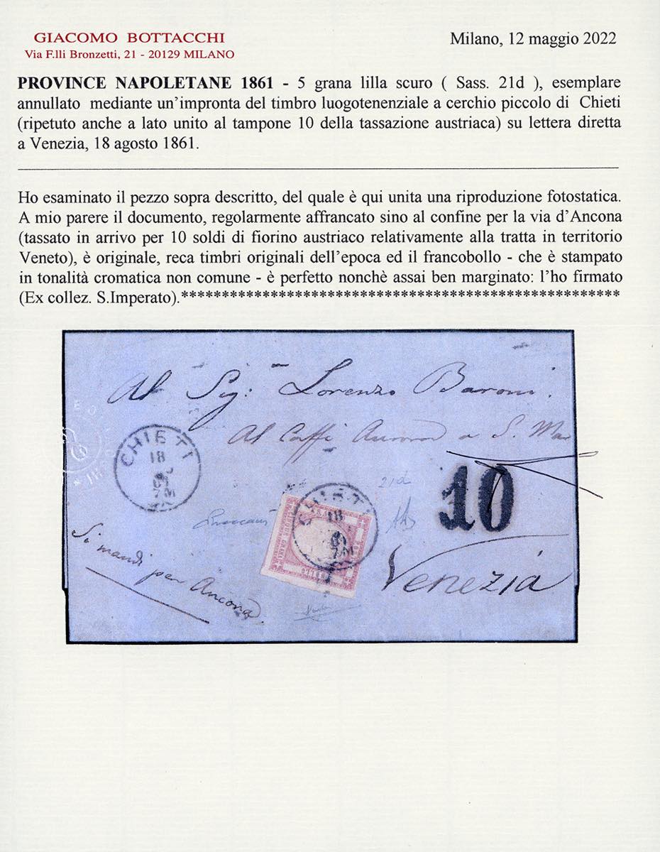 1861 - 5 grana lilla scuro (21d), perfetto, isolato su lettera da Chieti 18/8/1860 a Venezia, tassata con bollo a tampone 10. Raro uso isolato di questa pregevole tonalità, impreziosito dalla destinazione Veneto, del tutto non comune. A.Diena, Vaccari, Raybaudi, cert. Bottacchi. Ex coll. Imperato.