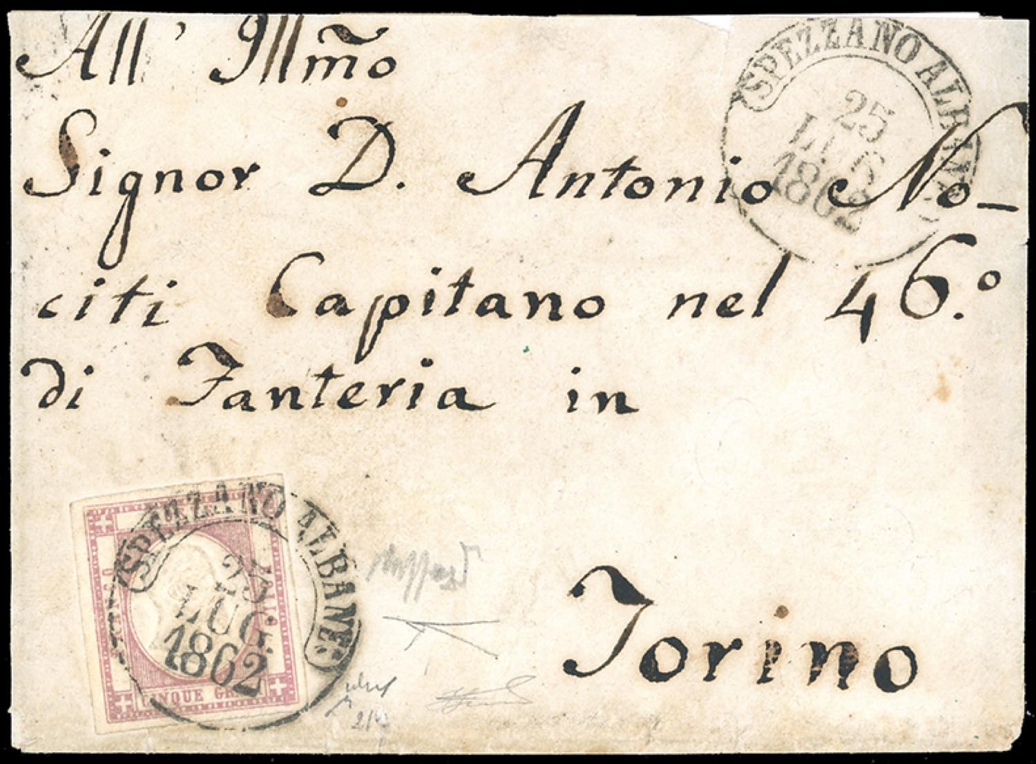1862 - 5 grana lilla scuro (21d), perfetto, su busta indirizzata ad un Capitano del 46° di Fanteria di Spezzano Albanese 25/7/1862 a ... Read more