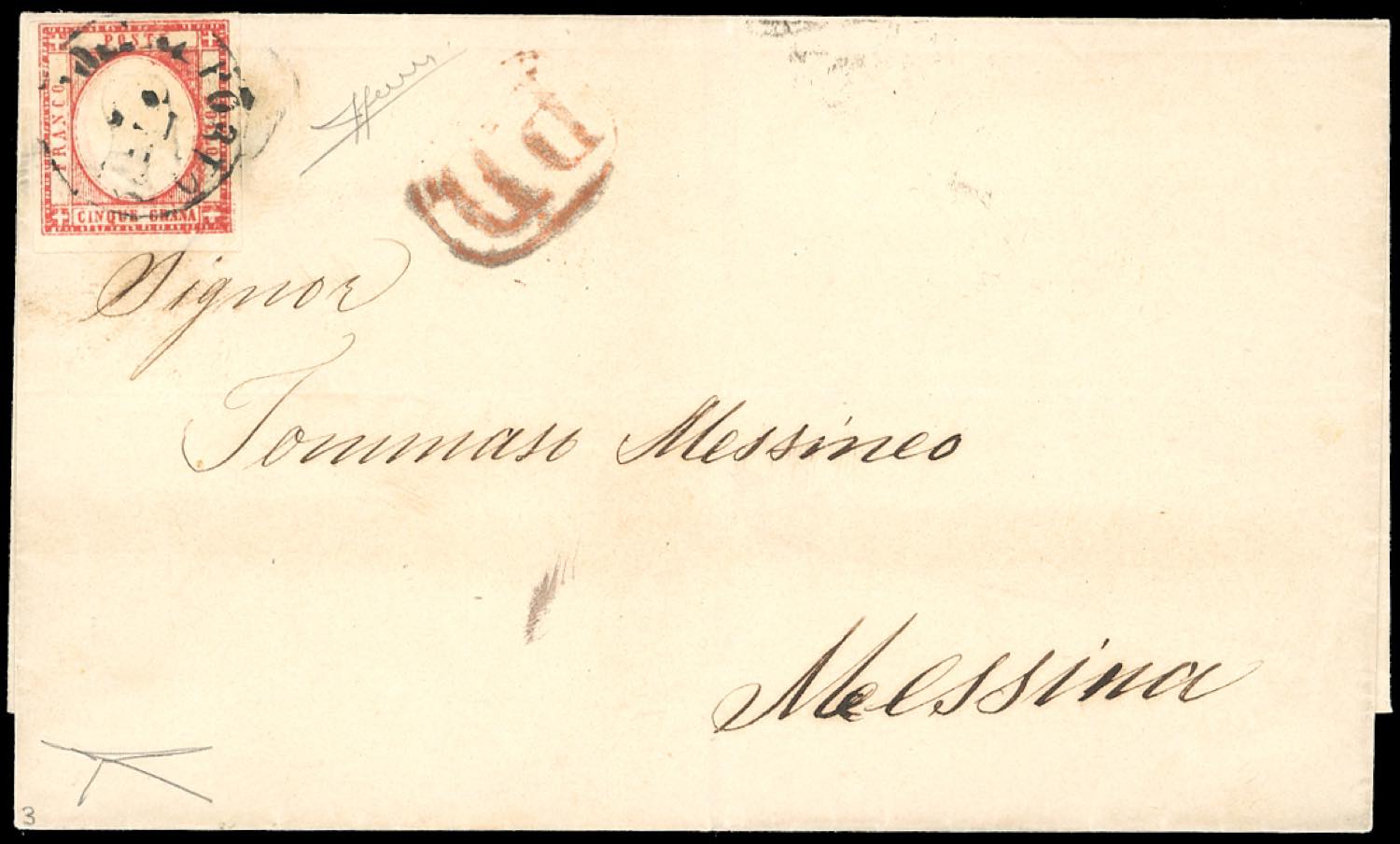 1861 - 5 grana carminio (21f), stampa smossa e forte inchiostrazione a destra, perfetto, su fresca sovracoperta di lettera da Napoli 20/09/1861 a Messina. Bella e rara varietà, di ottima qualità. Sorani, cert. Bottacchi. Ex coll. Imperato.