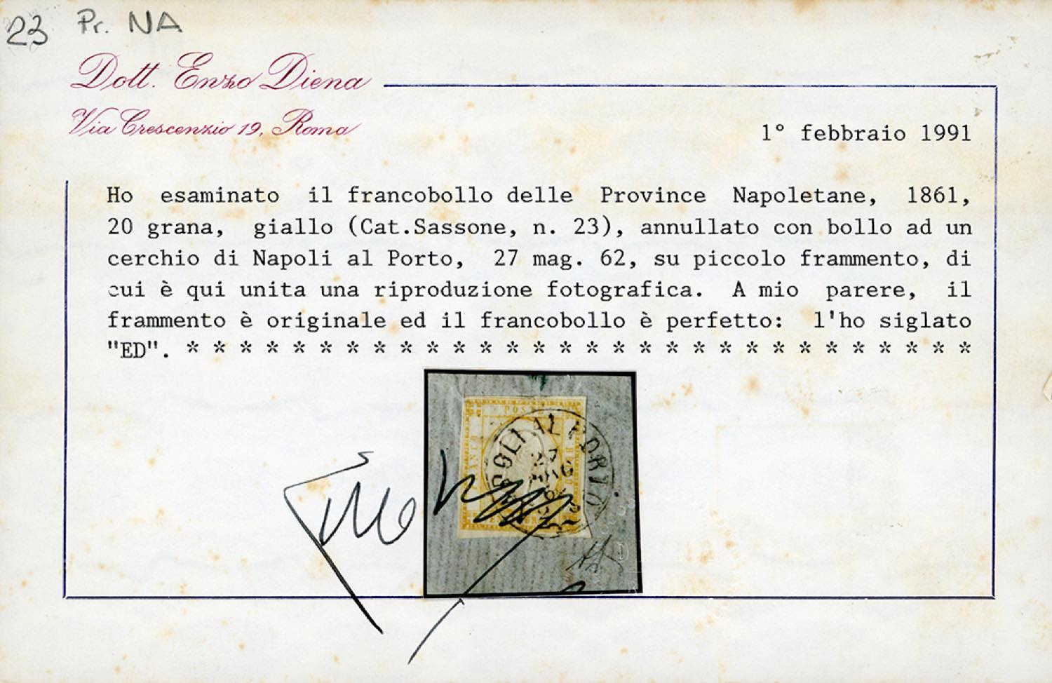 1861 - 20 grana giallo (23), perfetto, usato su frammento a Napoli 27/5/1862. A.Diena, Ferrario, cert. E.Diena. Ex coll. Imperato.