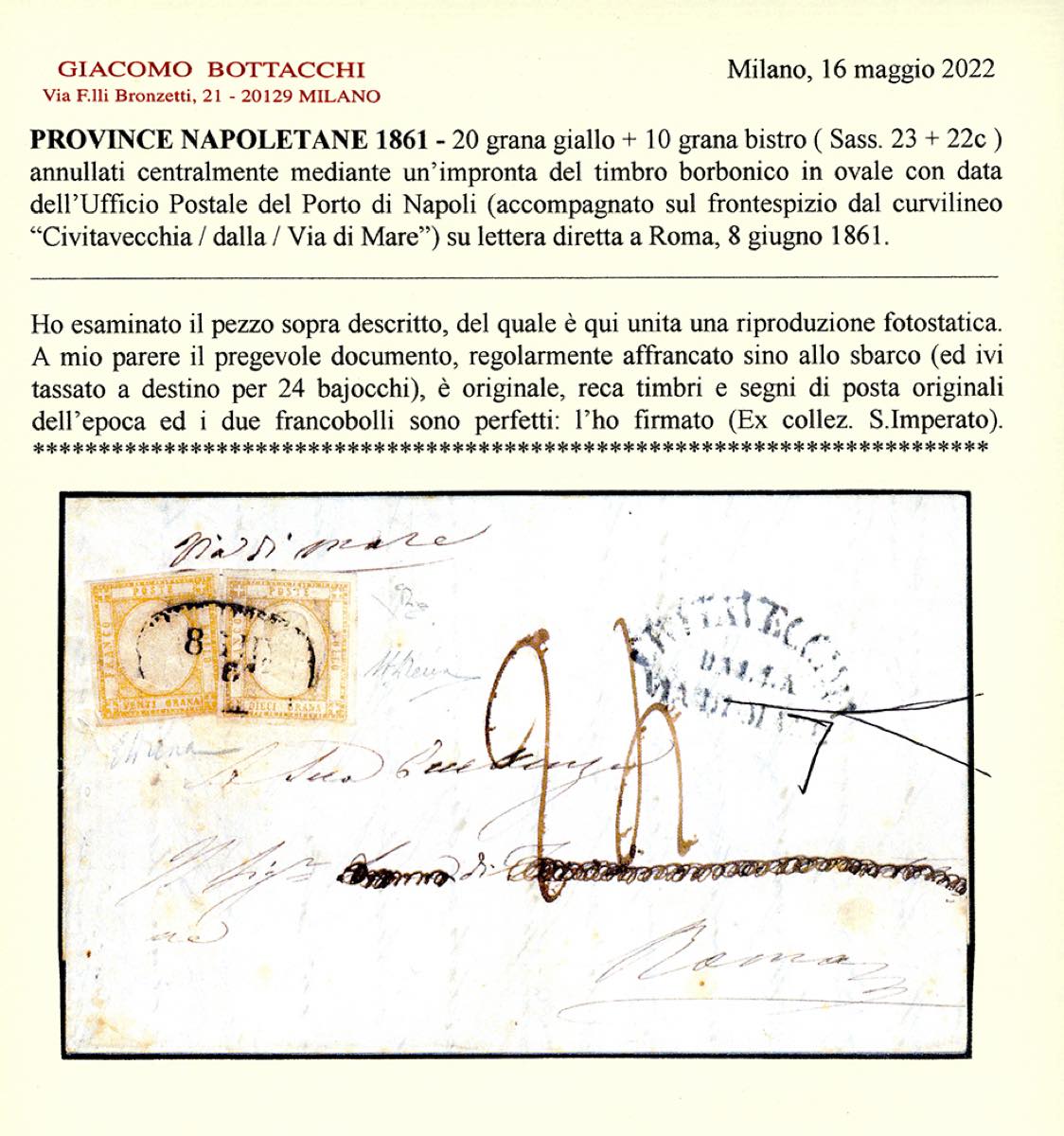 1861 - 20 grana giallo, 10 grana bistro (23,22c), perfetti, su lettera da Napoli 8/6/1861 a Roma, tassata 24 grana, bollo "Civitavecchia dalla via di mare" sul fronte. Rara! Emilio, Alberto ed Enzo Diena, tutti per esteso, cert. Bottacchi.