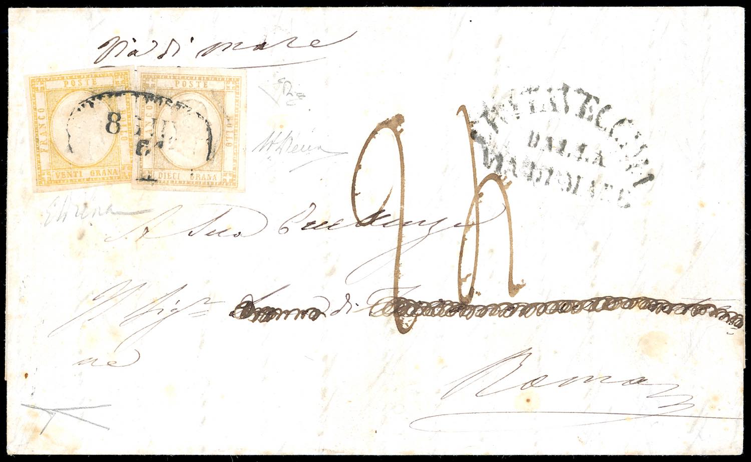 1861 - 20 grana giallo, 10 grana bistro (23,22c), perfetti, su lettera da Napoli 8/6/1861 a Roma, tassata 24 grana, bollo "Civitavecchia ... Read more