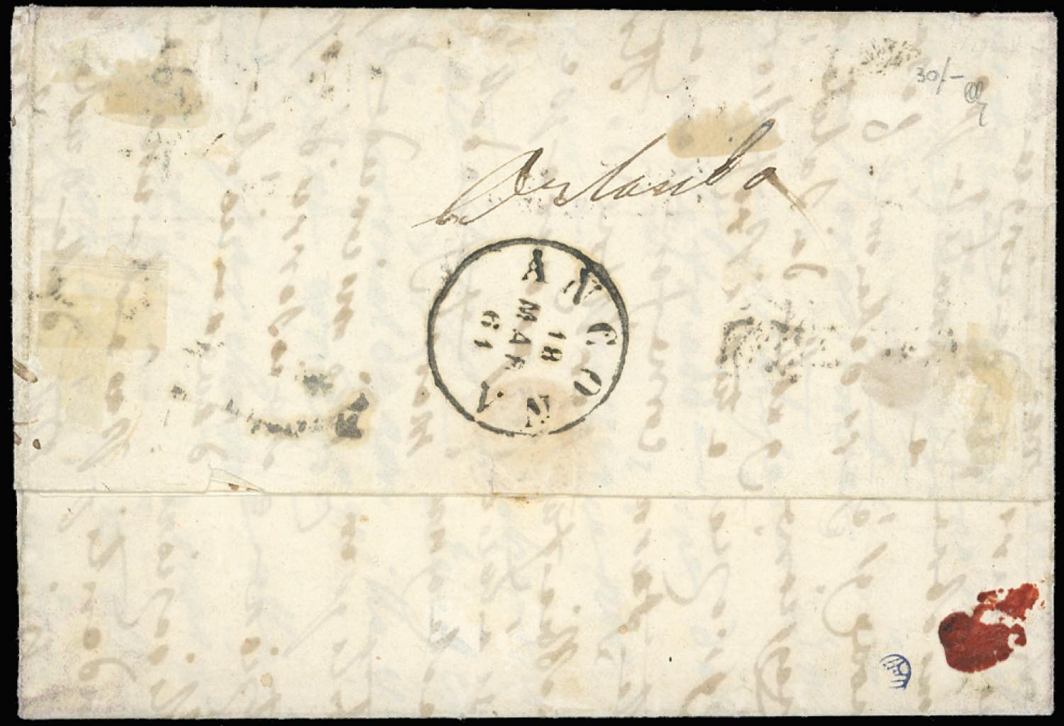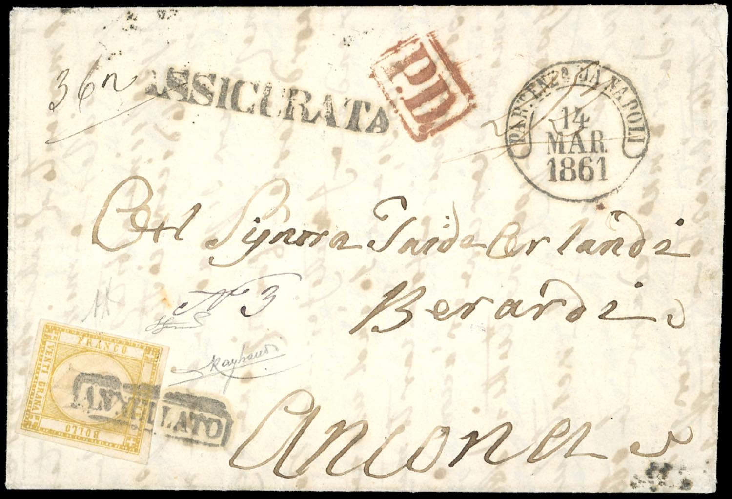 1861 - 20 grana bistro olivastro (23ba), perfetto, isolato su lettera assicurata da Napoli 14/3/1861 ad Ancona. Uso isolato estremamente raro, impreziosito dalla rarissima tinta, nonché dall'uso precedente alla proclamazione del Regno d'Italia. Spettacolare e da esposizione! A.Diena, Raybaudi. Cert. Ferrario e Colla.