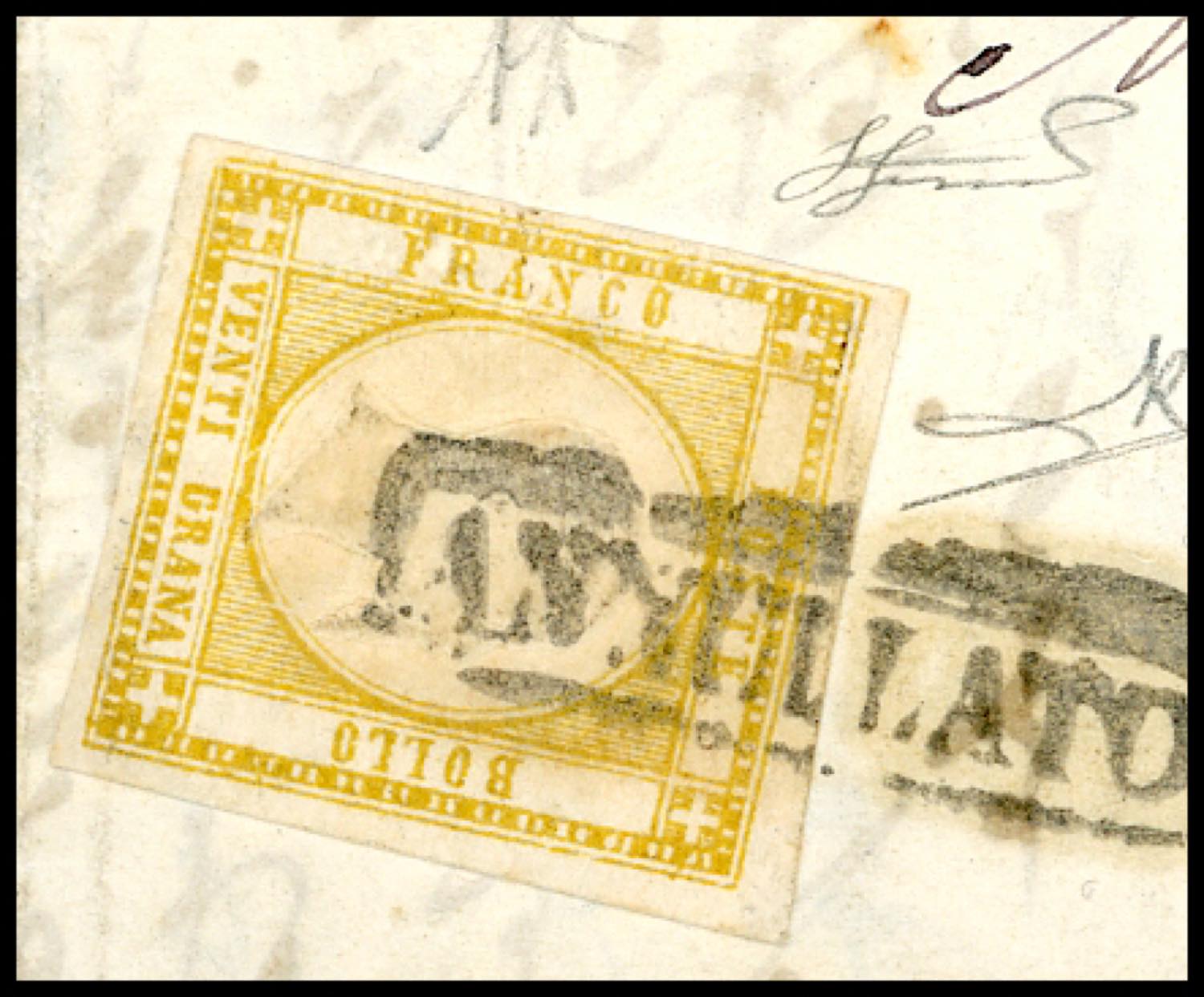 1861 - 20 grana bistro olivastro (23ba), perfetto, isolato su lettera assicurata da Napoli 14/3/1861 ad Ancona. Uso isolato estremamente ... Read more