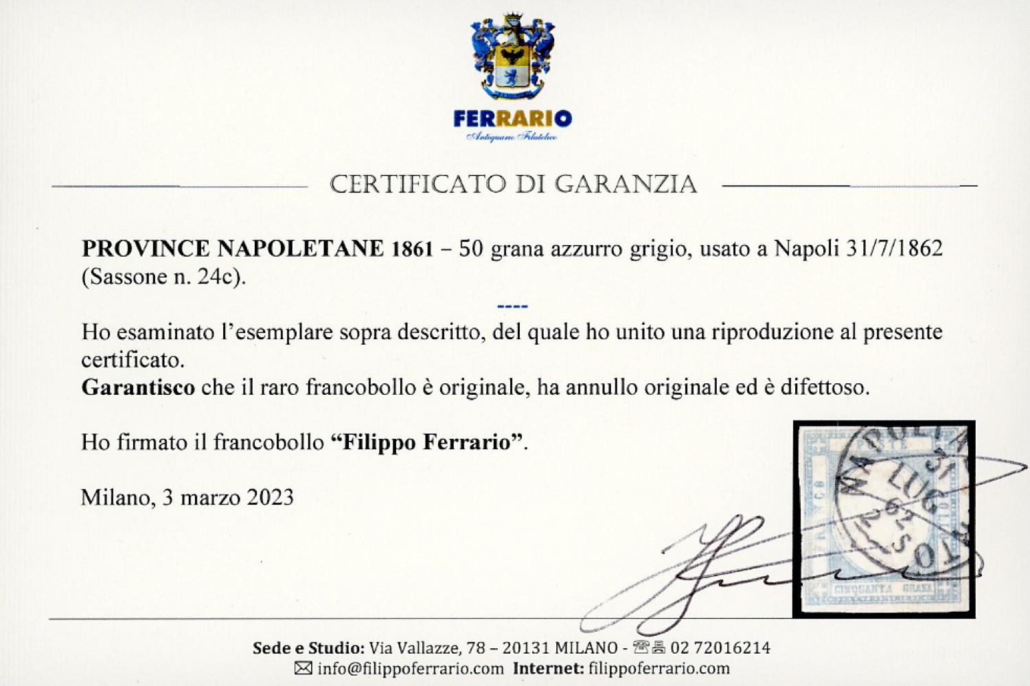 1861 - 50 grana azzurro grigio (24c), difettoso, usato a Napoli 31/7/1862. Raro, molto fresco e di ottimo aspetto generale. Occasione. Cert. Ferrario.