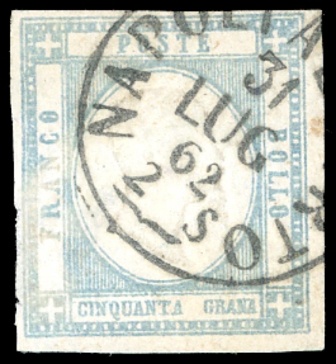 1861 - 50 grana azzurro grigio (24c), difettoso, usato a Napoli 31/7/1862. Raro, molto fresco e di ottimo aspetto generale. Occasione. ... Read more