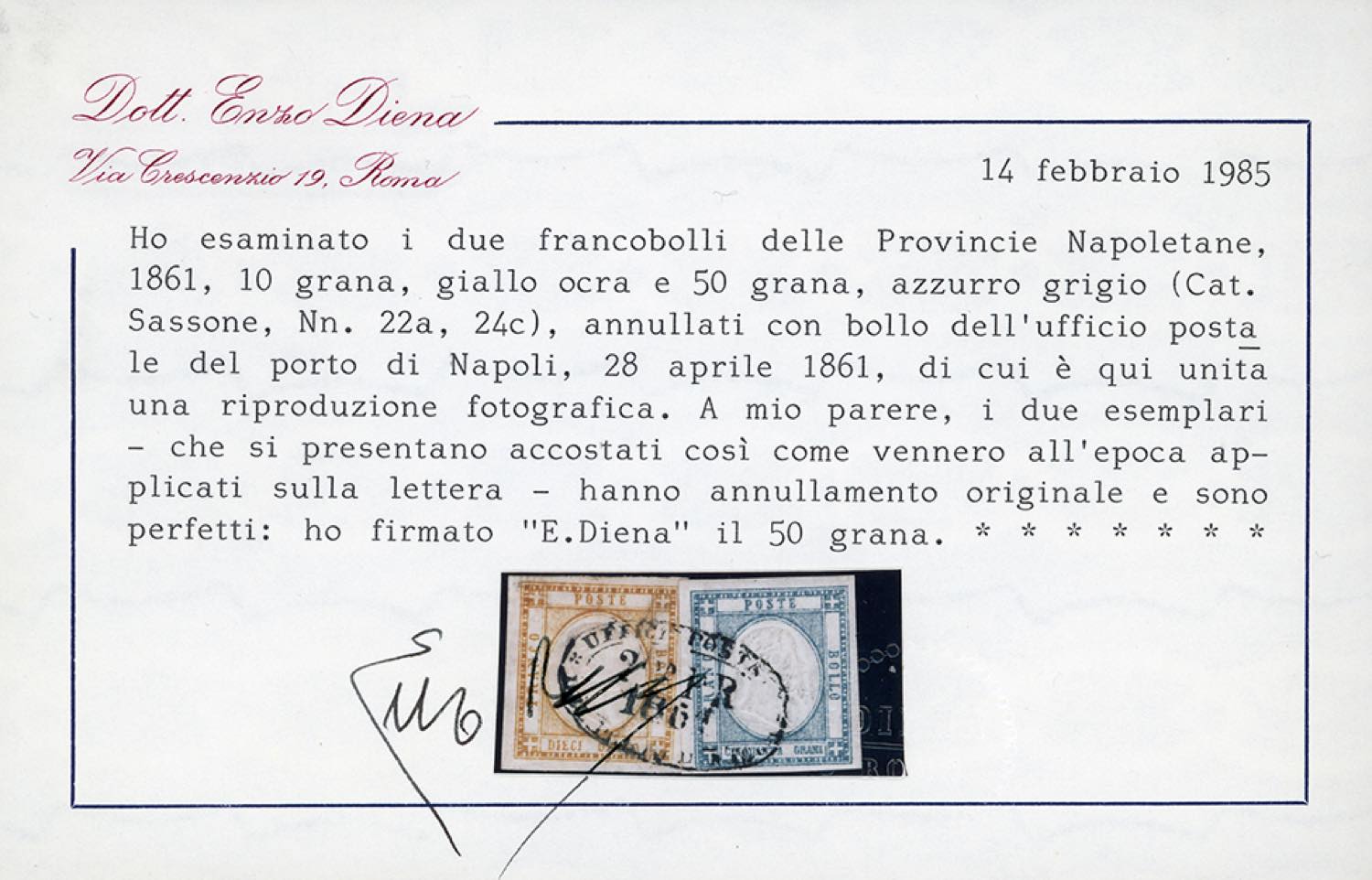 1861 - 50 grana azzurro grigio, 10 grana giallo ocra (24c,22a), perfetti, ricongiunti tramite linguella nella posizione originaria e annullati a Napoli 28/4/1860. Raro insieme di ottima qualità. Em.Diena, Ferrario, cert. E.Diena. Ex coll. Imperato.