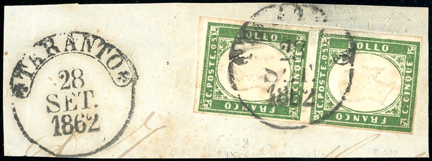 1862 - 5 cent. verde scuro IV emissione di Sardegna (13D), coppia perfetta, usata su frammento a Taranto 28/9/1862. Interessante e non ... Read more