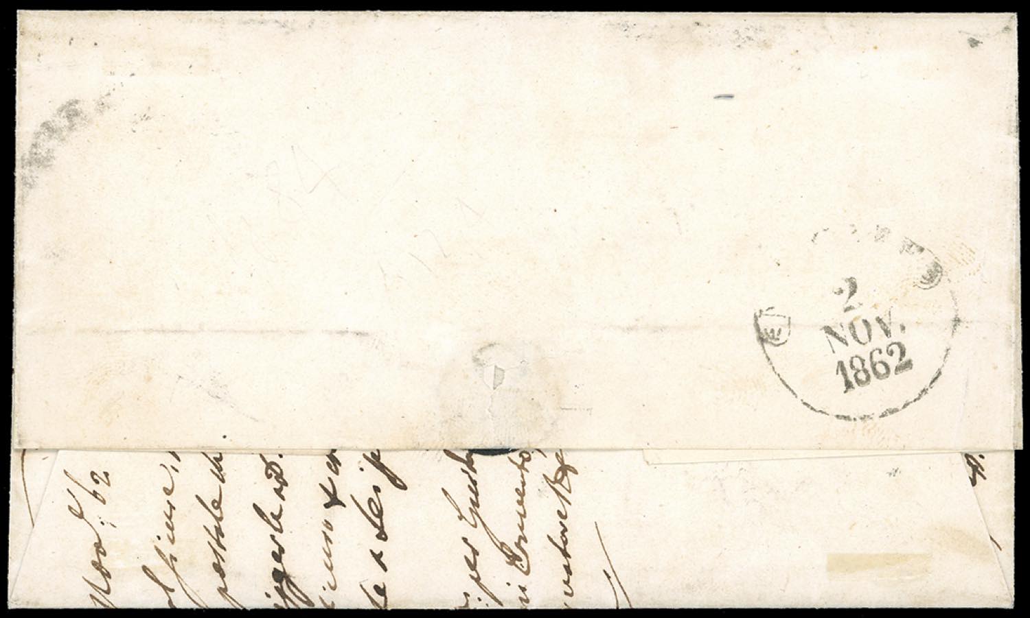 1862 - 1 grano nero (19), due esemplari, uno perfetto l'altro con margine destro sfiorato, su lettera da Napoli 28/10/1862 a Scorrano. I ... Read more