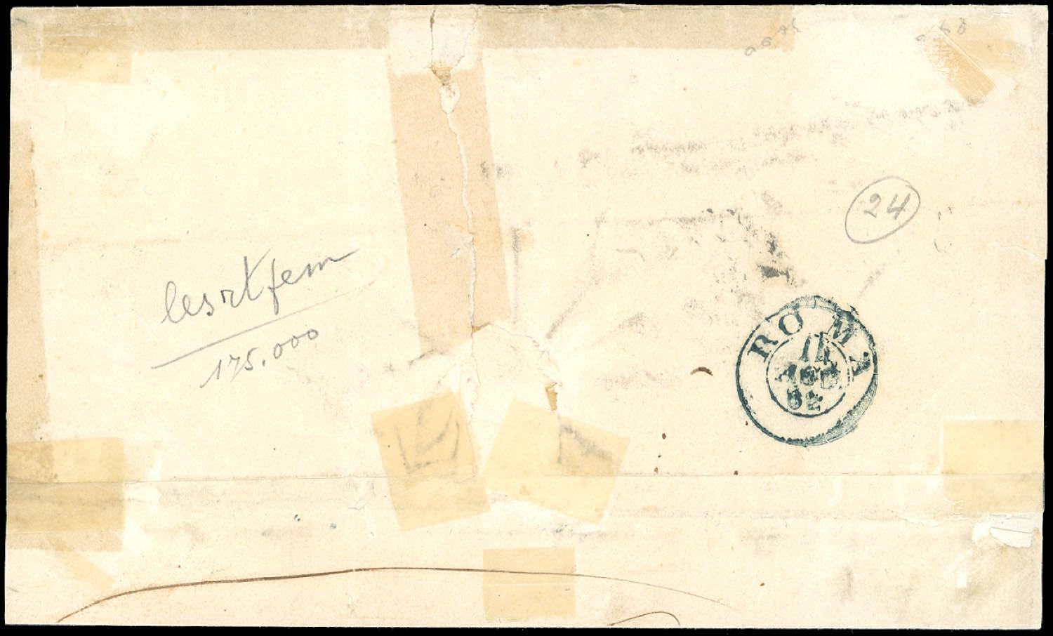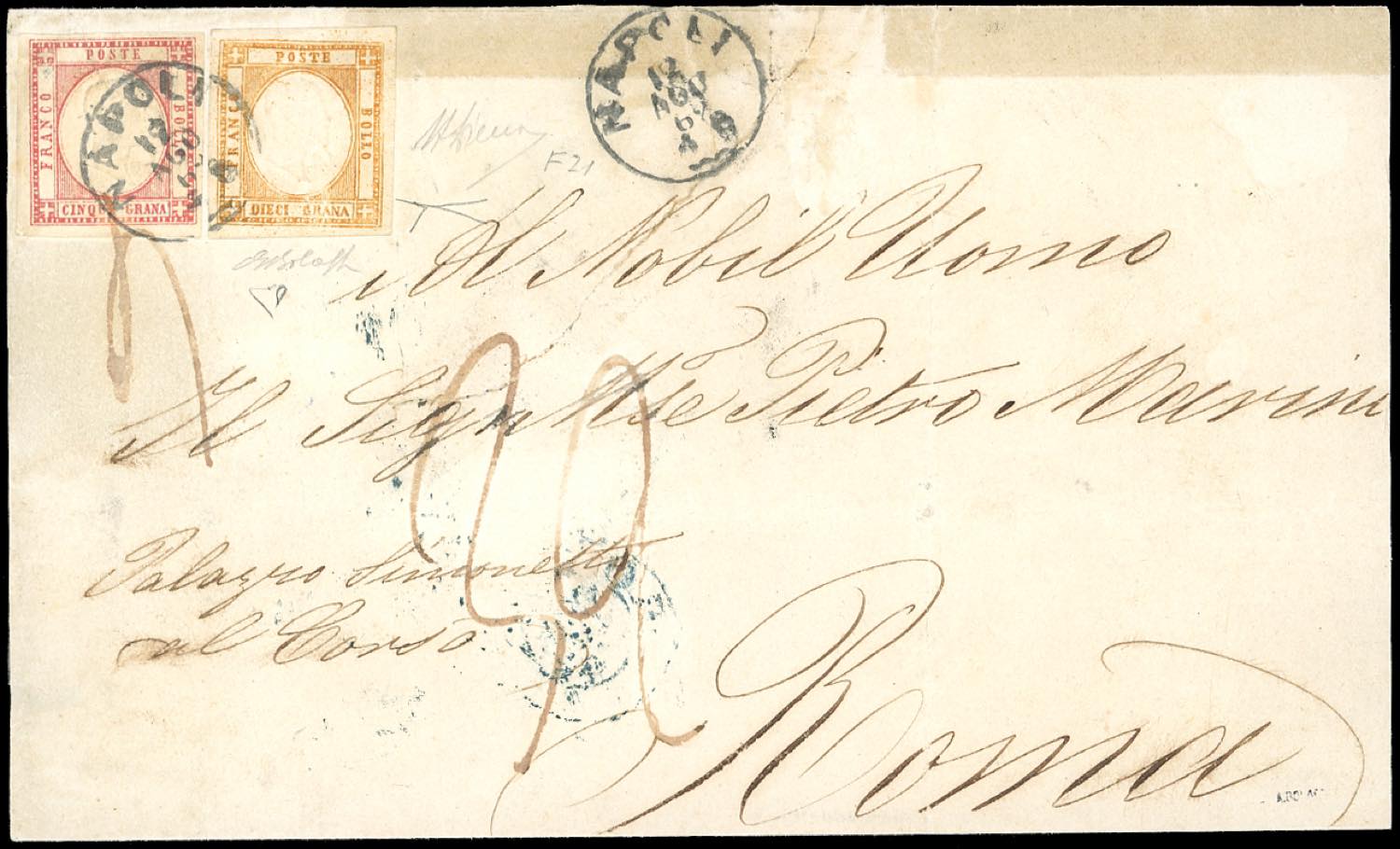1862 - 10 grana arancio, falso per posta del II tipo, effigie C, 5 grana rosso carminio (F8,21), perfetti, su sovracoperta di lettera da Napoli 12/8/1862 a Roma, tassata 32 baj per il quarto porto interno pontificio. Molto rara. G.Bolaffi, A. ed E.Diena, cert. Bottacchi. Ex coll. Imperato.