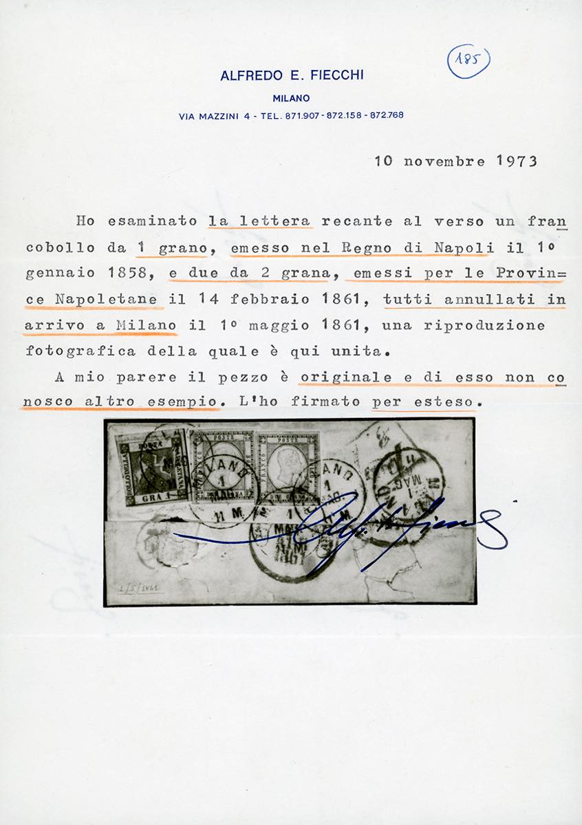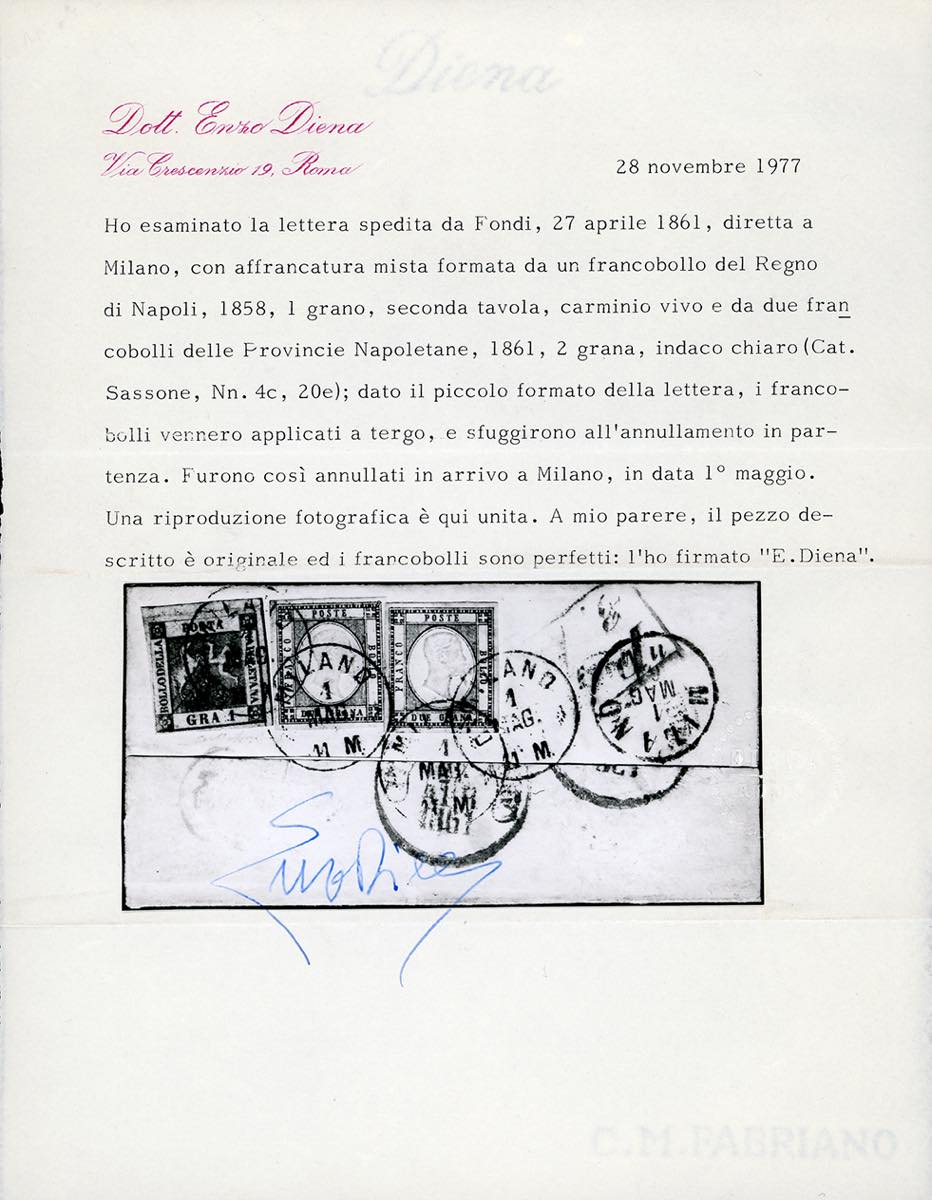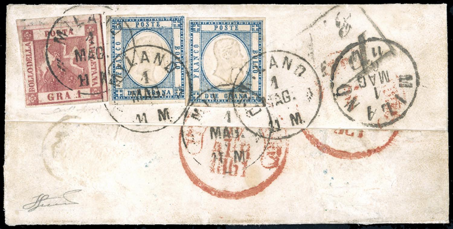 1861 - 1 grano carminio vivo, II tavola, di Napoli, in affrancatura mista con 2 grana indaco chiaro Province Napoletane, due esemplari (4b,20e), tutti perfetti, applicati al verso di lettera (contro la normativa postale) da Fondi 27/4/1861 a Milano, dove i francobolli, sfuggiti all'obliterazione in partenza, vennero annullati l'1/5/1861 con il datario con ore. ECCEZIONALE ED UNICO CASO NOTO DI AFFRANCATURA MISTA ANNULLATA DA UNA LOCALITA' ESTERNA AI CONFINI DELLE PROVINCE NAPOLETANE. Da esposizione! Cert. E.Diena, Fiecchi e Ferrario. Ex coll. Imperato.