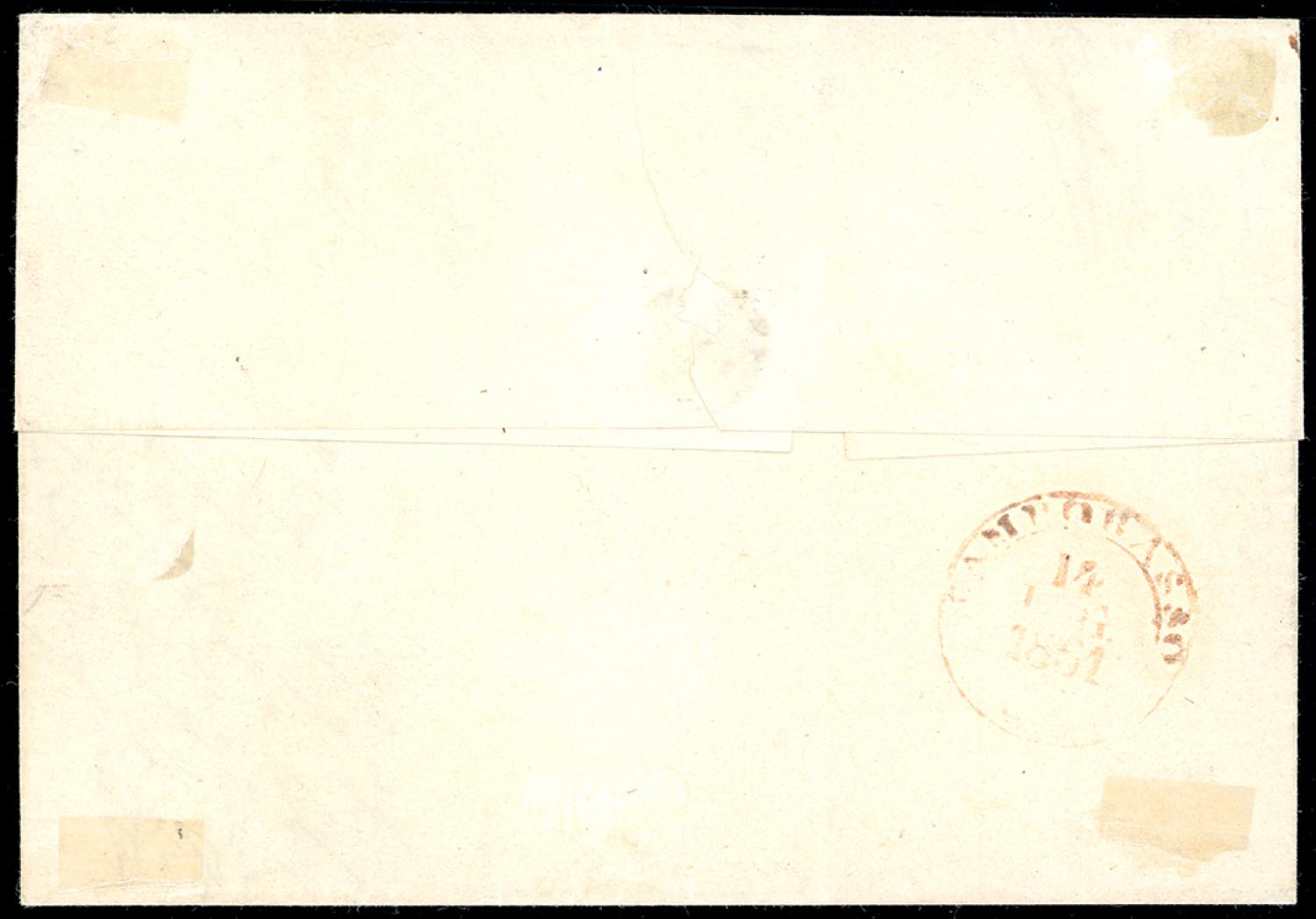 1861 - 1 grano carminio, II tavola (4a), perfetto e ben marginato, in affrancatura mista con 2 grana azzurro chiaro (20), intaccato a sinistra, su fresca lettera da Napoli 13/7/1861 a Campobasso. Rara. Grioni, Chiavarello, cert. Ferrario. Ex coll. Imperato.