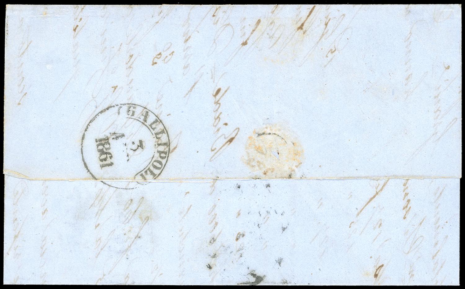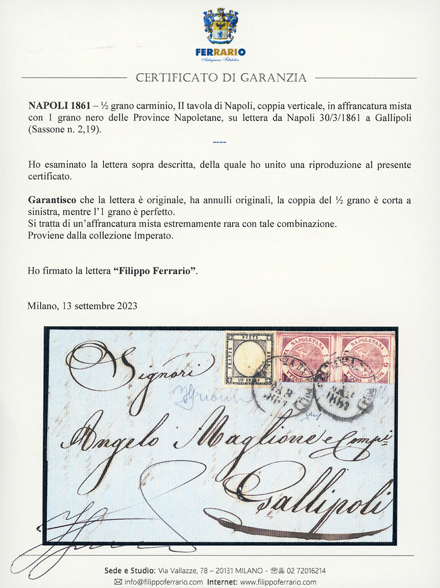 1861 - 1/2 grano carminio, II tavola, coppia verticale, in affrancatura mista con 1 grano nero Province Napoletane, perfetto (2,19), su fresca lettera da Napoli 30/3/1861 a Gallipoli. Affrancatura mista estremamente rara con tale combinazione. Grioni, Emilio Diena, Chiavarello, cert. Ferrario. Ex coll. Imperato.