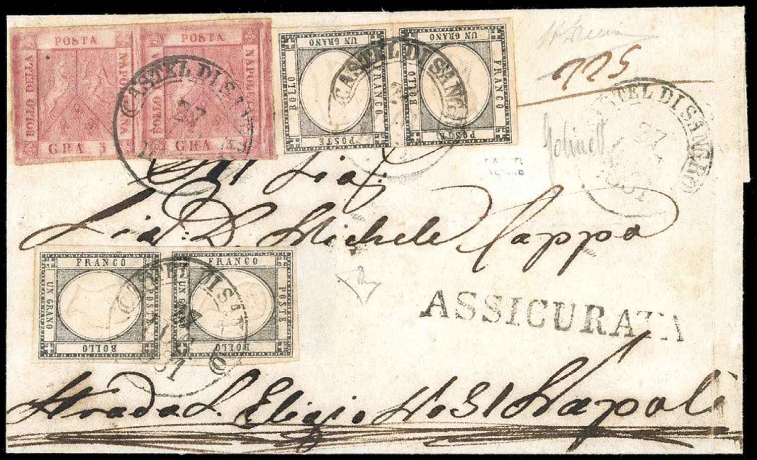 1861 - 5 grana carminio vivo, II tavola, coppia (9a), in affrancatura mista con 1 grano nero grigiastro delle Province Napoletane, due coppie (19a), ottimo stato, su lettera assicurata, parzialmente incompleta al verso, da Castel di Sangro 27/7/1861 (punti 13) a Napoli, bollo d'arrivo. Raro insieme. A.Diena, Golinelli, Cert. E.Diena.