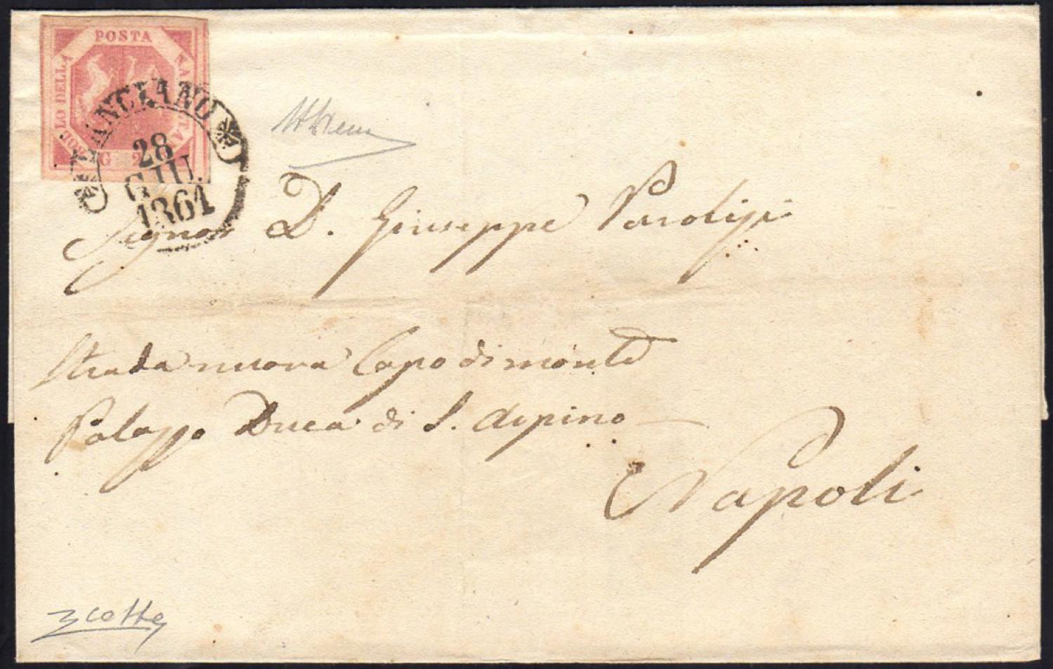 LANCIANO, cerchio punti 11 - 2 grana (7e), perfetto, su sovracoperta di lettera del 28/6/1861 per Napoli. Cert. A.Diena e Colla.
