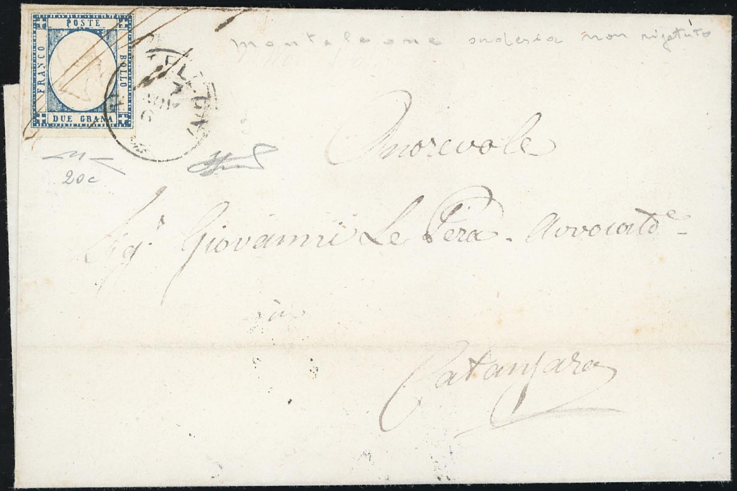 MONTELEONE, cerchio piccolo + penna, combinazione non catalogata - 2 grana azzurro ardesia (20c), perfetto, su sovracoperta di lettera del 17/11/1861 per Catanzaro. Combinazione di coannullatori inedita. Manzoni, cert. Ferrario.