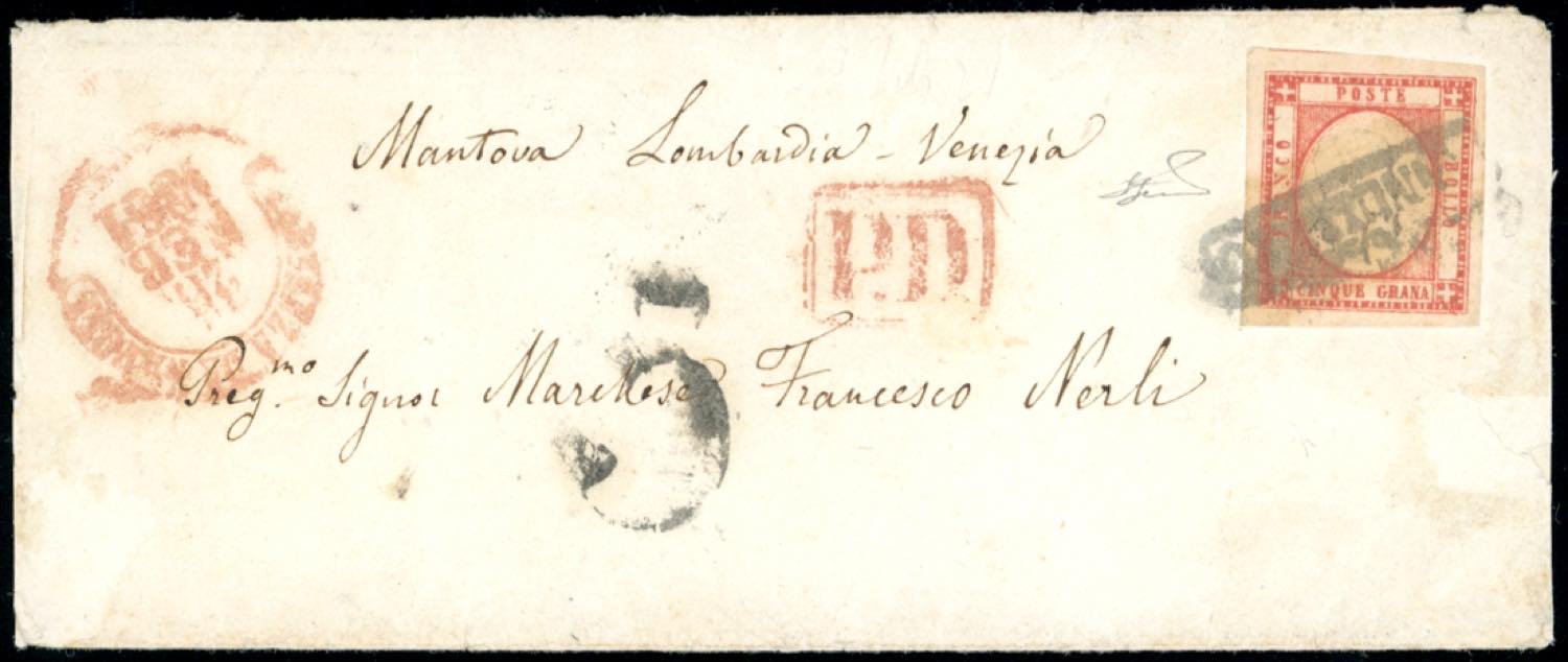 NAPOLI, annullato + cerchio rosso punti 7 - 5 grana (21), perfetto su busta del 26/2/1861 a Mantova, tassata 5 soldi. Ferrario. Ex coll. Imperato.