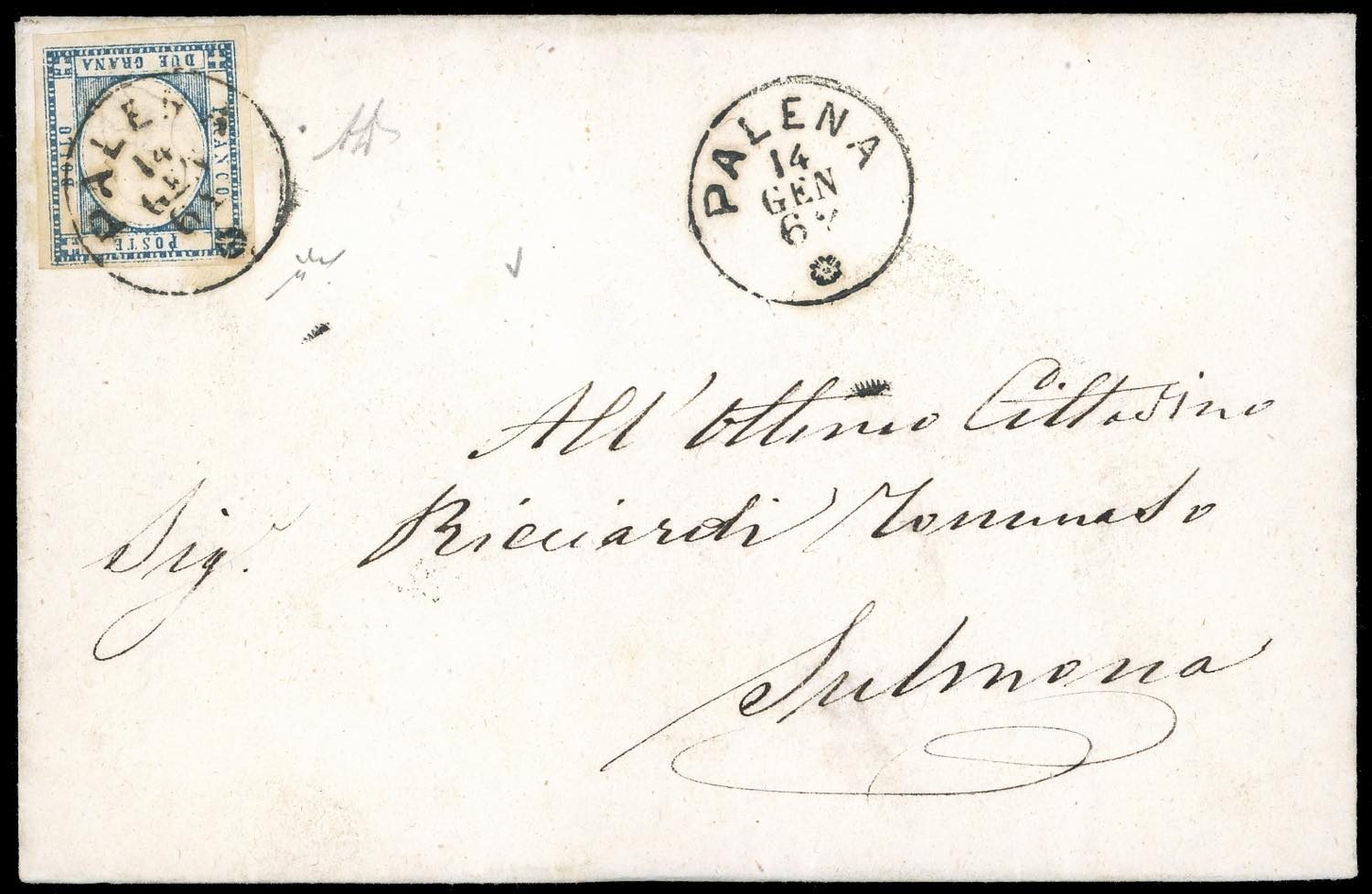 PALENA, punti 7 - 2 grana (20d), perfetto, su fresca lettera del 14/1/1862 a Sulmona. Bella. A.Diena, Chiavarello. Ex coll. Imperato.