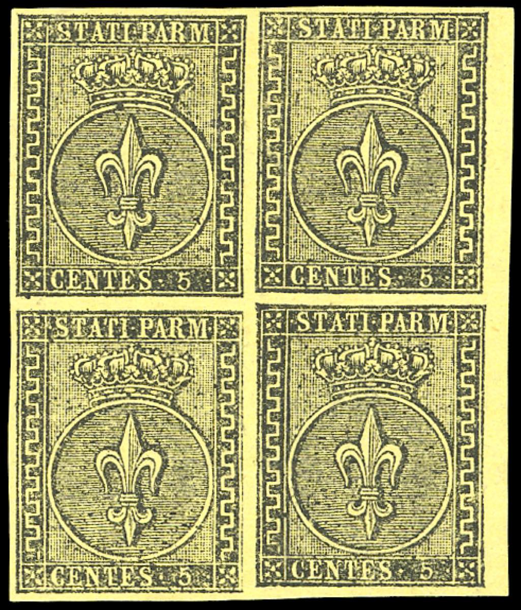 1852 - 5 cent. giallo arancio (1), blocco di quattro nuovo, gomma originale, integra, per i due esemplari inferiori, perfetto. Bellissimo. Ferrario.