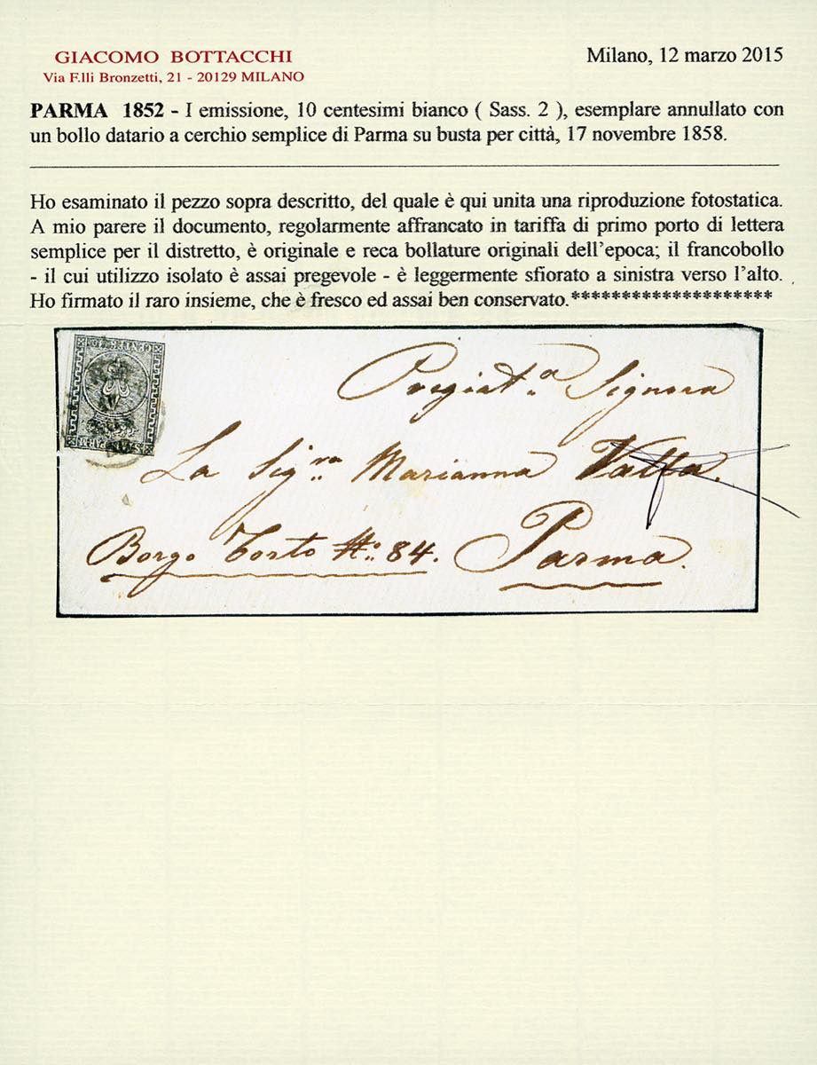 1858 - 10 cent. bianco (2), appena sfiorato a sinistra, su busta da Parma 17/11/1858 per città. Uso isolato molto raro! Cert. Bottacchi.
