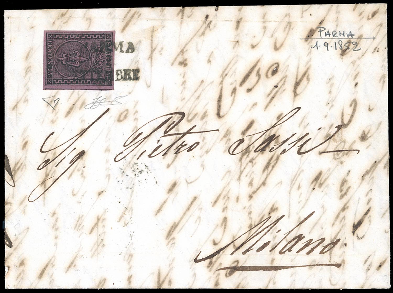 1852 - 25 cent. violetto (4), perfetto e con grandi margini, su lettera da Parma 1/9/1852 a Milano. E.Diena, Ferrario.