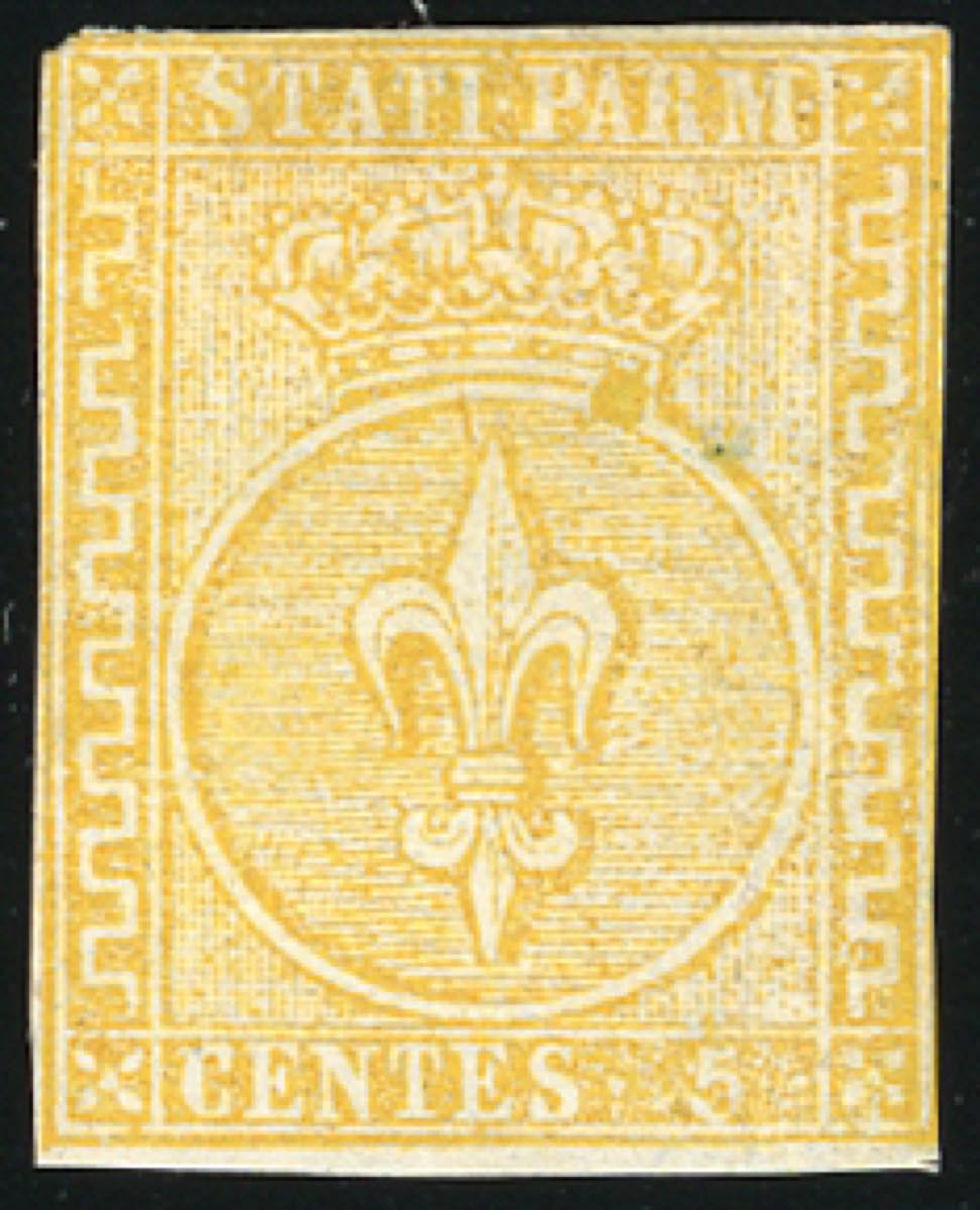 1853 - 5 cent. giallo arancio (6), varietà di clichè, nuovo senza gomma, margini da completi a leggermente sfiorati. Molto fresco, occasione. Ferrario.