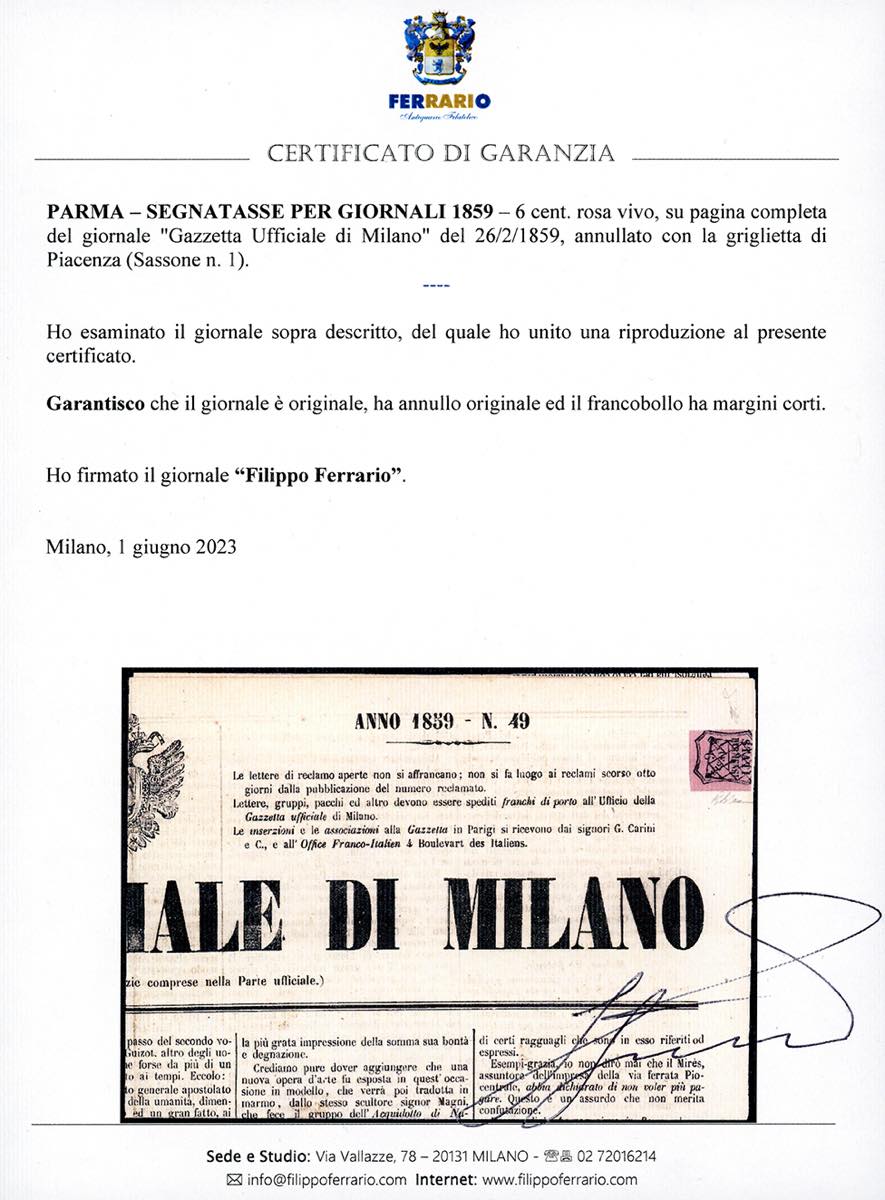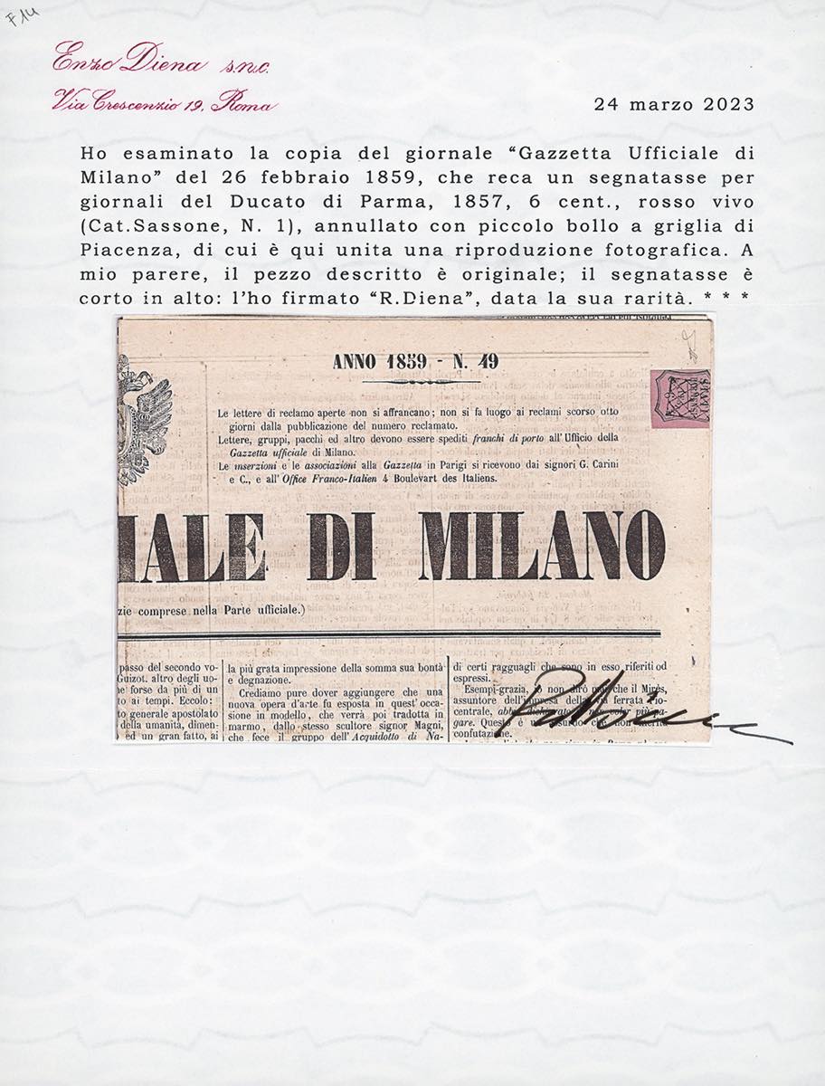 1859 - 6 cent. rosa vivo (1), corto in alto, annullato con la griglietta di Piacenza, su pagina completa del giornale "Gazzetta Ufficiale di Milano" del 26/2/1859. Raro e molto fresco, occasione. Cert. Diena e Ferrario.