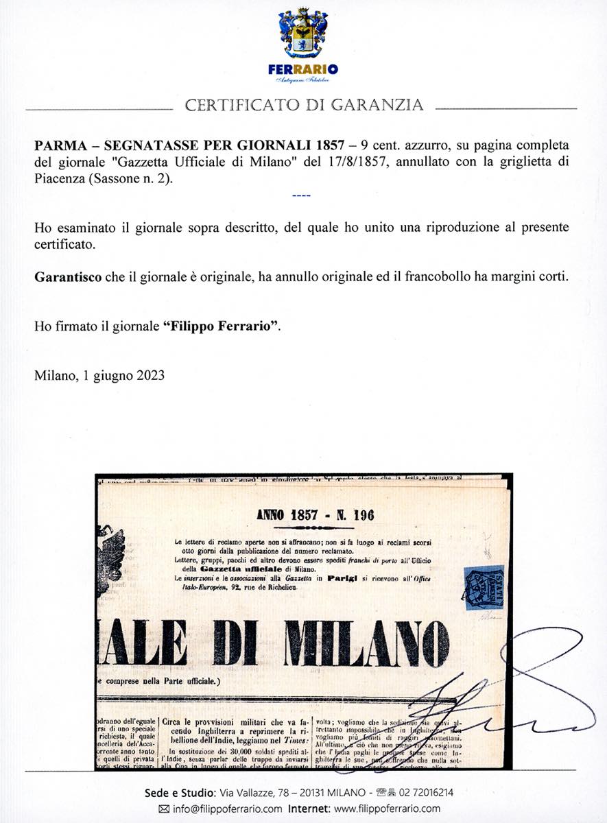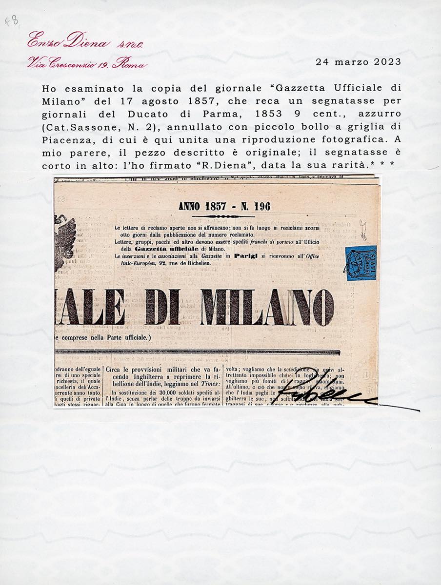 1857 - 9 cent. azzurro (2), corto in alto, annullato con la griglietta di Piacenza, su pagina completa del giornale "Gazzetta Ufficiale di Milano" del 17/8/1857. Raro e molto fresco, occasione. Cert. Diena e Ferrario.