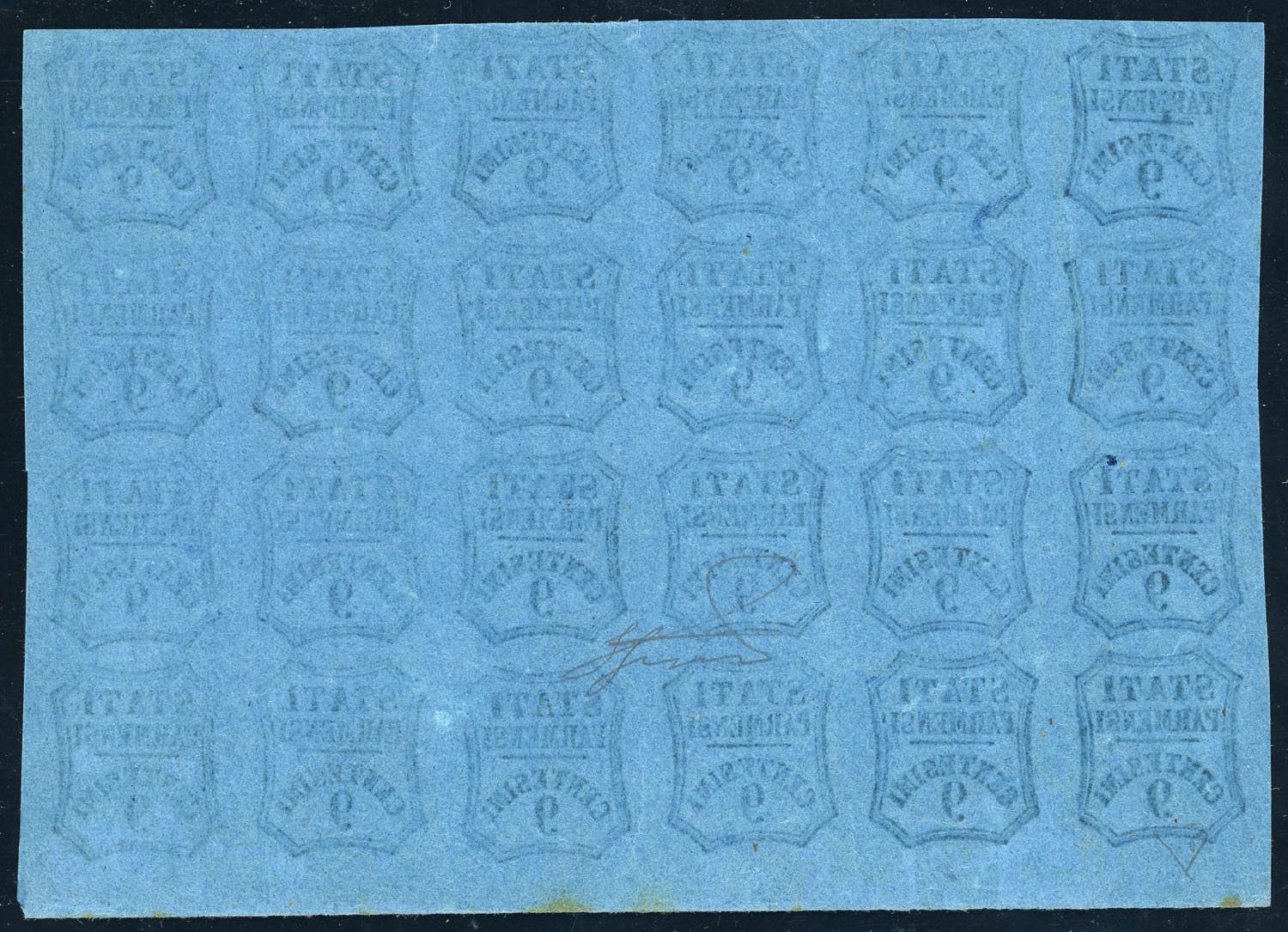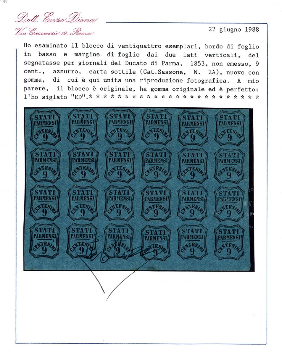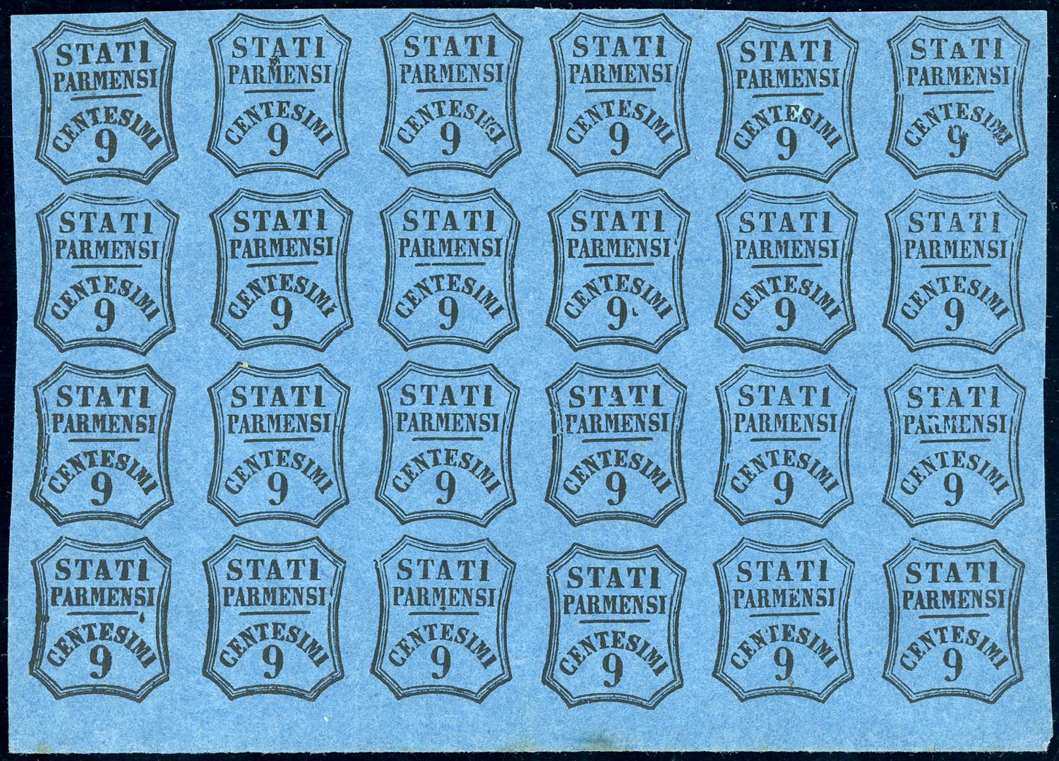 1857 - 9 cent. azzurro, non emesso (2A), blocco di 24 esemplari, diversi con varietà di clichè, bordo di foglio, gomma originale integra, perfetto e molto fresco. Raro. Ferrario, cert. E.Diena.