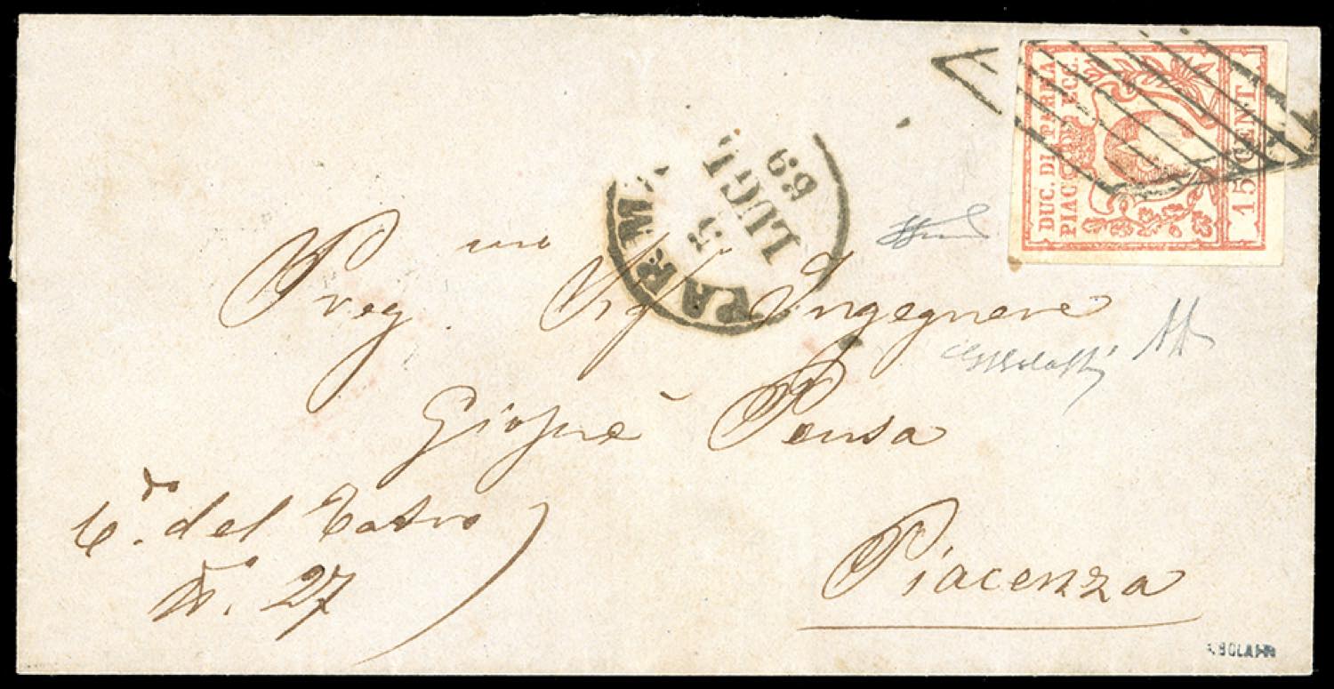 1859 - 15 cent. vermiglio, varietà stampa mancante (9), perfetto, su fresca lettera da Parma 5/7/1859 a Piacenza, in periodo di Governo Provvisorio. Bellissima ed appariscente. A.Diena, Ferrario, cert. G.Bolaffi.