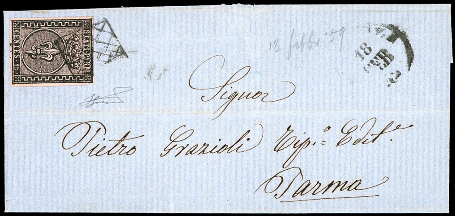 PIACENZA, griglietta + cerchio piccolo punti R3 - 15 cent. rosa (3), perfetto, su fresca lettera del 18/2/1859 a Parma. Rarità degli annulli del Ducato. Ottima qualità, pochissime lettere esistenti. Cert. Ferrario.
