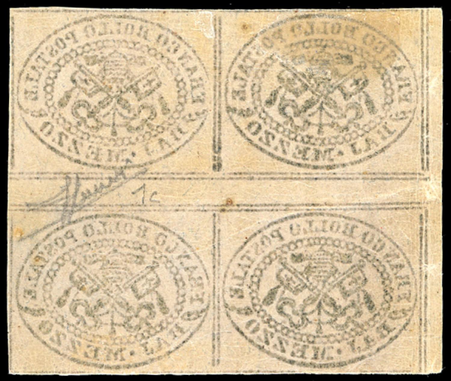 Lot 515 - 1852 - 1/2 baj grigio lilla (1c), blocco di quattro con ...