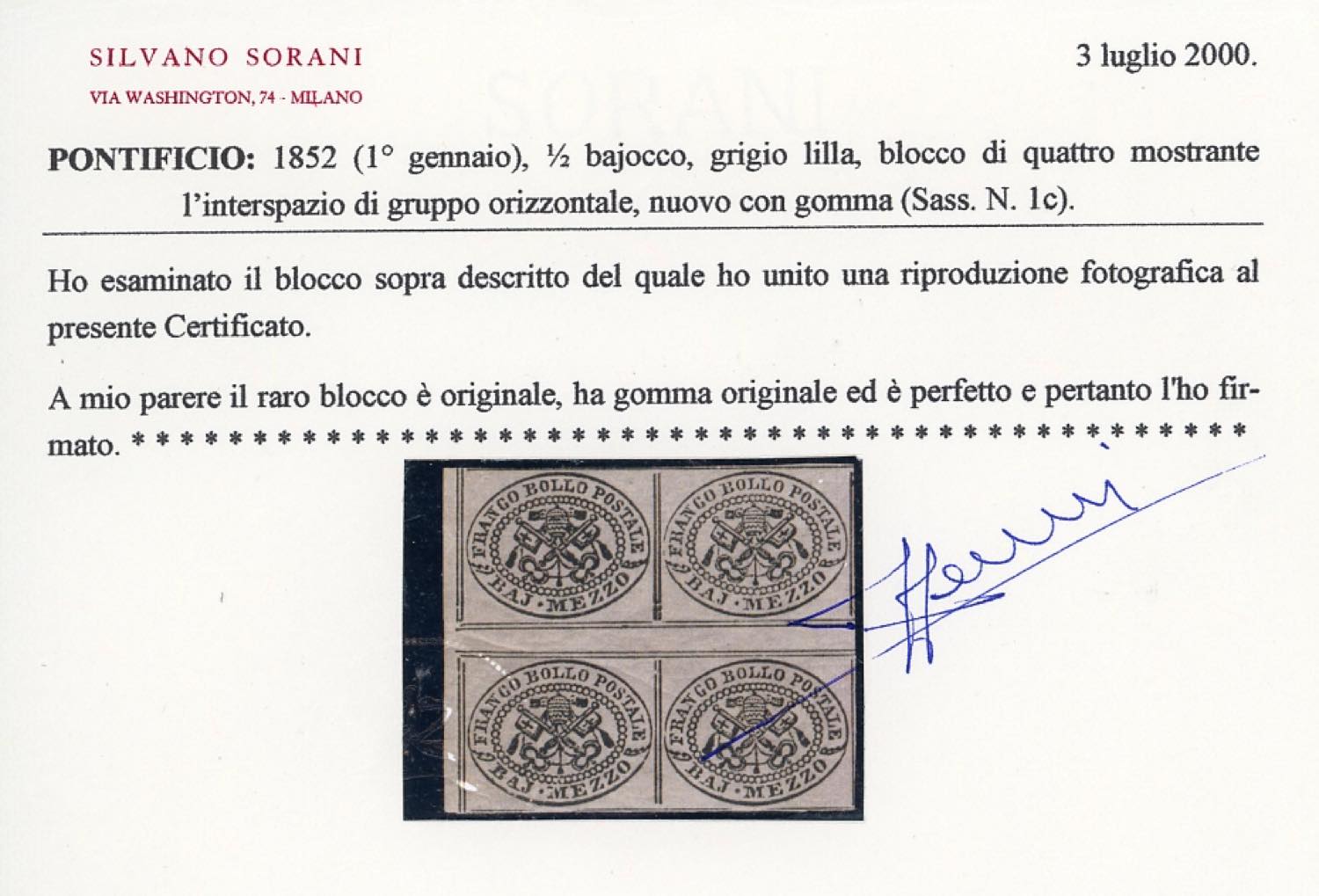 1852 - 1/2 baj grigio lilla (1c), blocco di quattro con interspazio di gruppo orizzontale al centro, bordo di foglio, gomma originale, perfetto. Bello! Cert. Sorani.