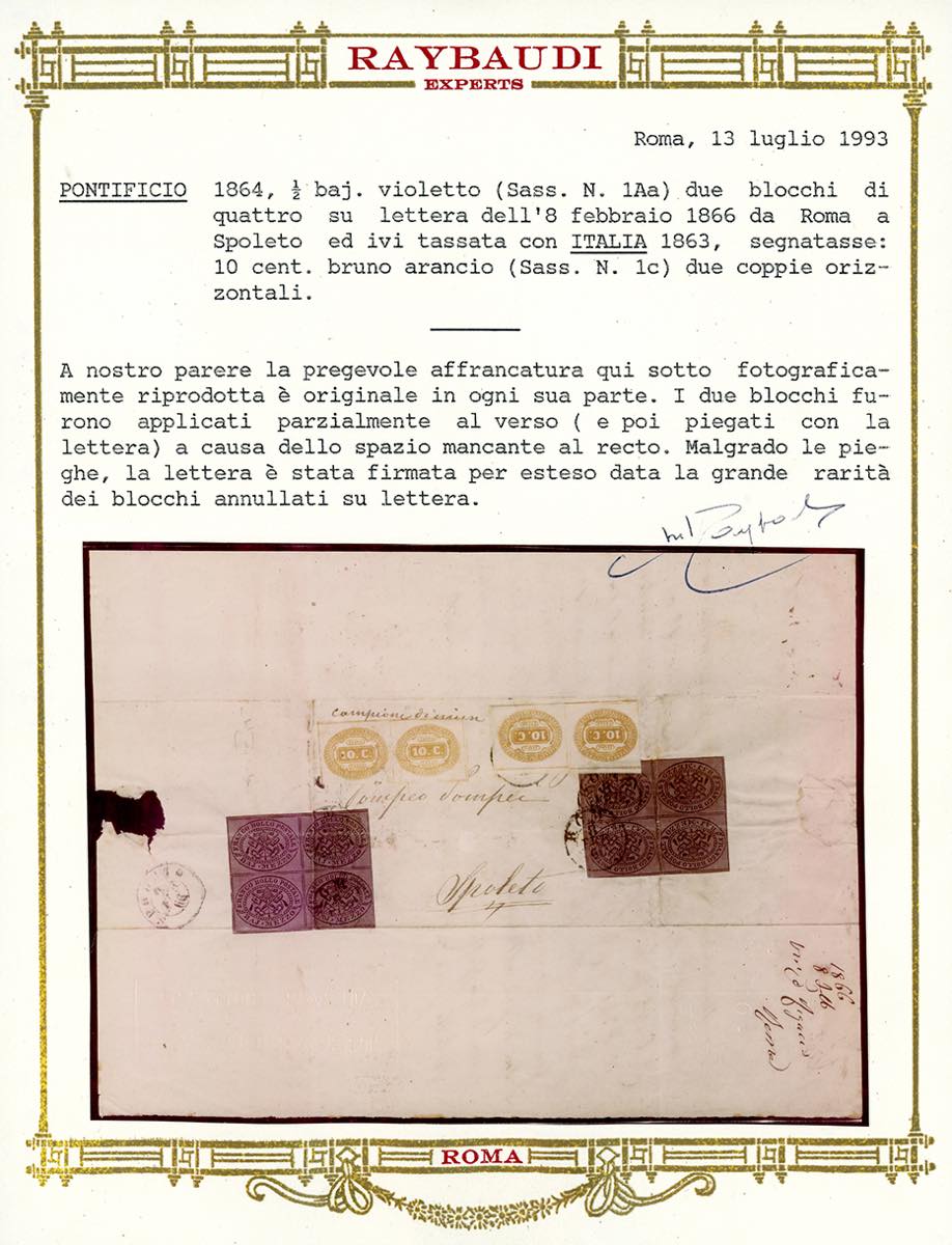 1866 - 1/2 baj violetto (1Aa), due blocchi di quattro, applicati a cavallo, su lettera contenente "campioni di niun valore" da Roma 8/2/1866 a Spoleto, tassata in arrivo con il segnatasse da 10 cent. bruno arancio (Regno 1c), due coppie, perfette. Affrancatura multipla molto rara. Cert. Oro Raybaudi.