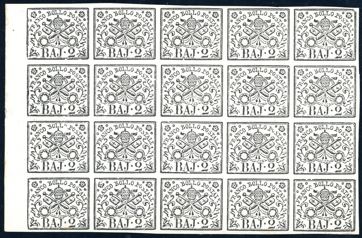 1867 - 2 baj bianco (3A), blocco di 20 esemplari, bordo di foglio, gomma originale integra, perfetto e molto fresco. Sorani, Ferrario.