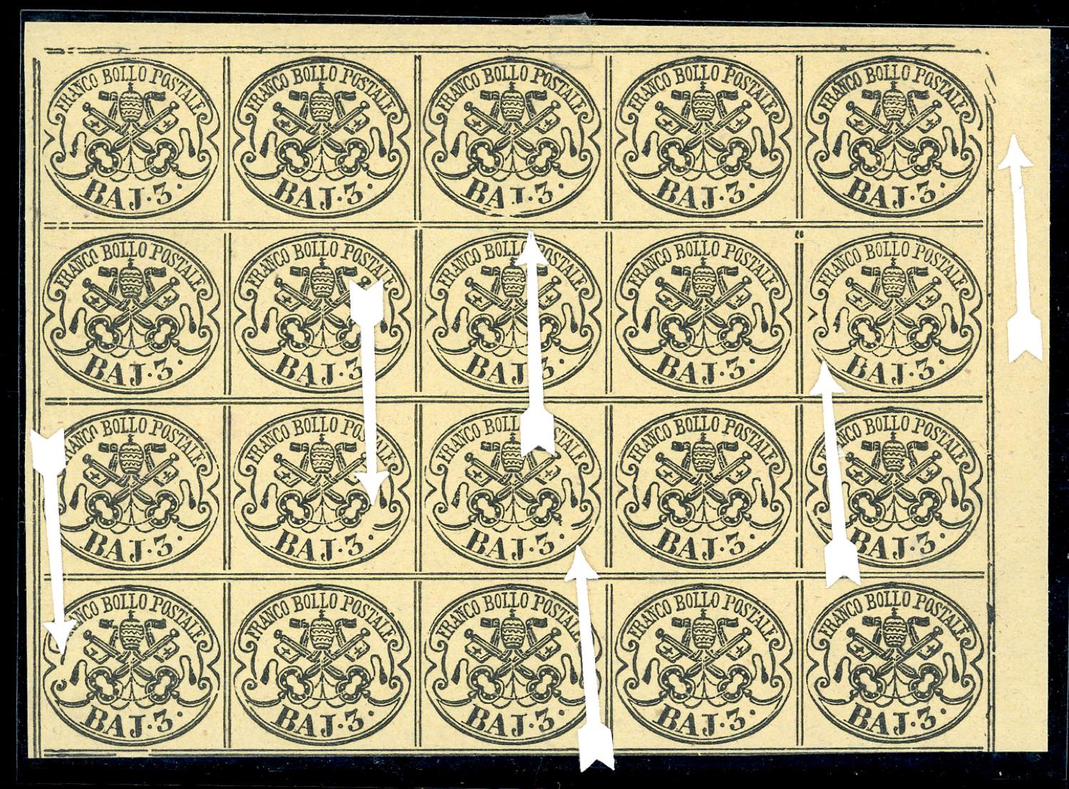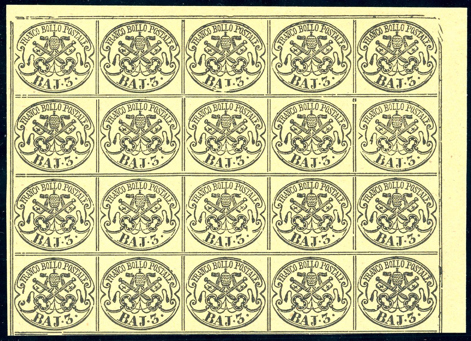 1863 - 3 baj giallo cromo (4A), blocco di 20 esemplari, sei con interessanti varietà di clichè, angolo di foglio, gomma originale integra, perfetto e di ottima qualità. Ferrario.