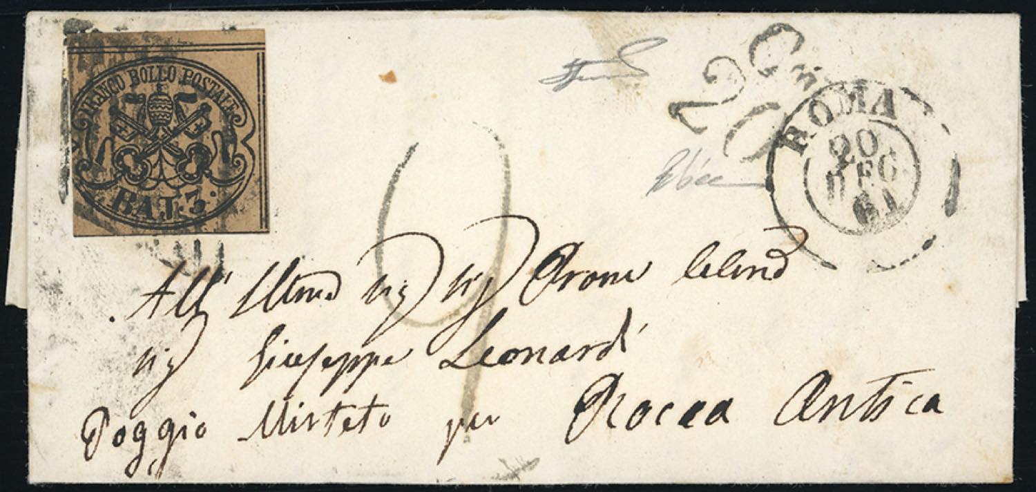 1861 - 3 baj bruno (4Aa), buono stato, isolato su lettera da Roma 20/12/1861 a Poggio Mirteto, tassata 2 a penna e con bollo di tassazione su due righe "C.mi20", molto raro. R.Diena, Ferrario.