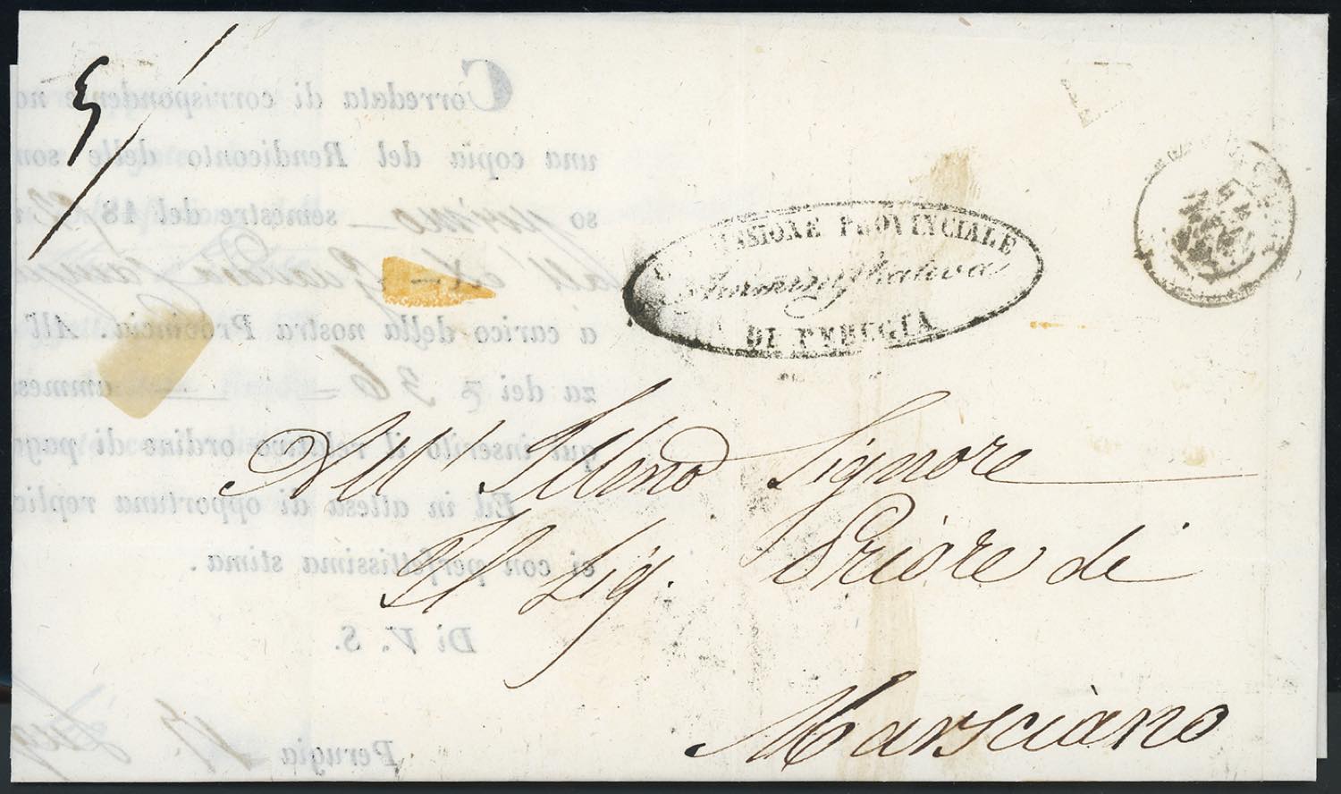 1852 - 5 baj bianco rosaceo (6a), perfetto, isolato al verso di lettera in porto assegnato di cinque porti da Perugia 17/7/1852, francobollo annullato con il bollo muto a griglietta, a Marsciano. Raro uso isolato per la tassazione del francobollo da 5 baj. E.Diena, Ferrario. Ex coll. Imperato.