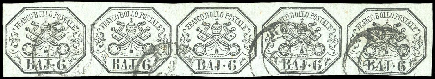 1852 - 6 baj grigio azzurrastro (7b), striscia orizzontale di cinque, perfetta, usata con datario a doppio cerchio di Roma, splendida! G.Bolaffi, Em., A., ed E.Diena. Ex coll. Imperato.