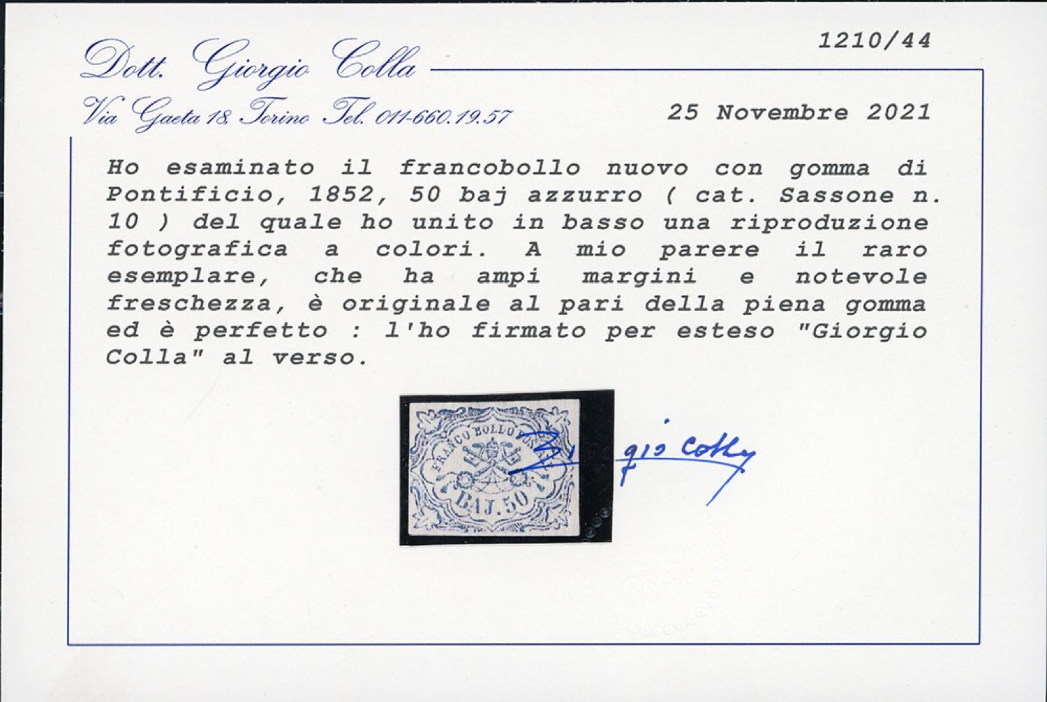 1852 - 50 baj azzurro (10), gomma originale, perfetto e ben marginato. Raro e di ottima qualità. A. ed E.Diena. Cert. Colla.