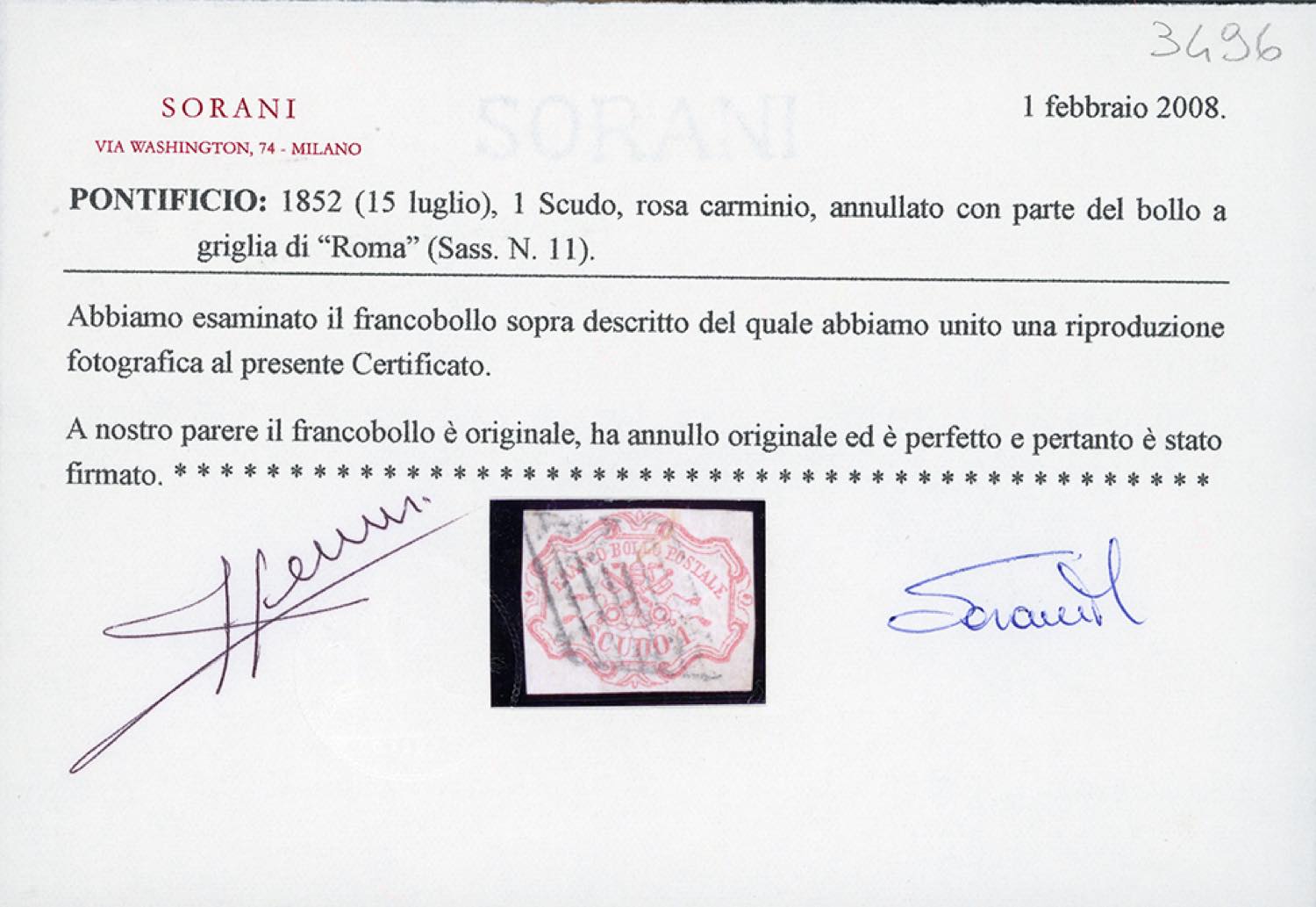 1852 - 1 scudo rosa carminio (11), perfetto e ben marginato su tutti i lati. Ottima qualità. Cert. Sorani.