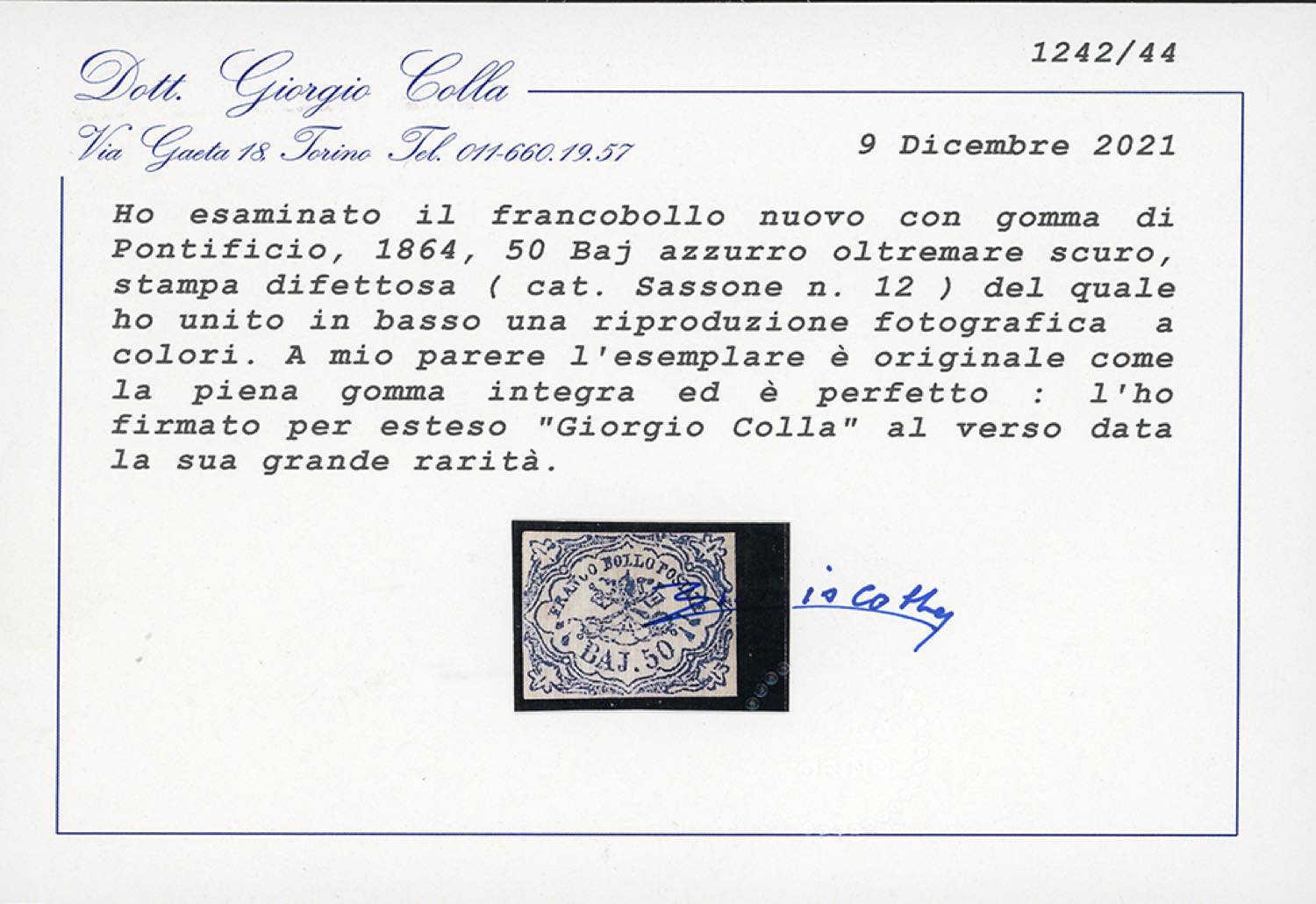 1864 - 50 baj azzurro oltremare scuro, stampa difettosa (12), gomma originale integra, perfetto. Estremamente raro. Sorani, cert. Colla.