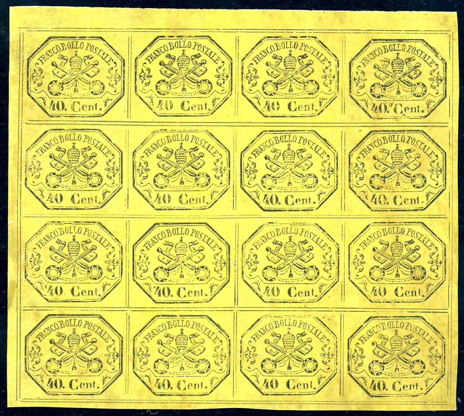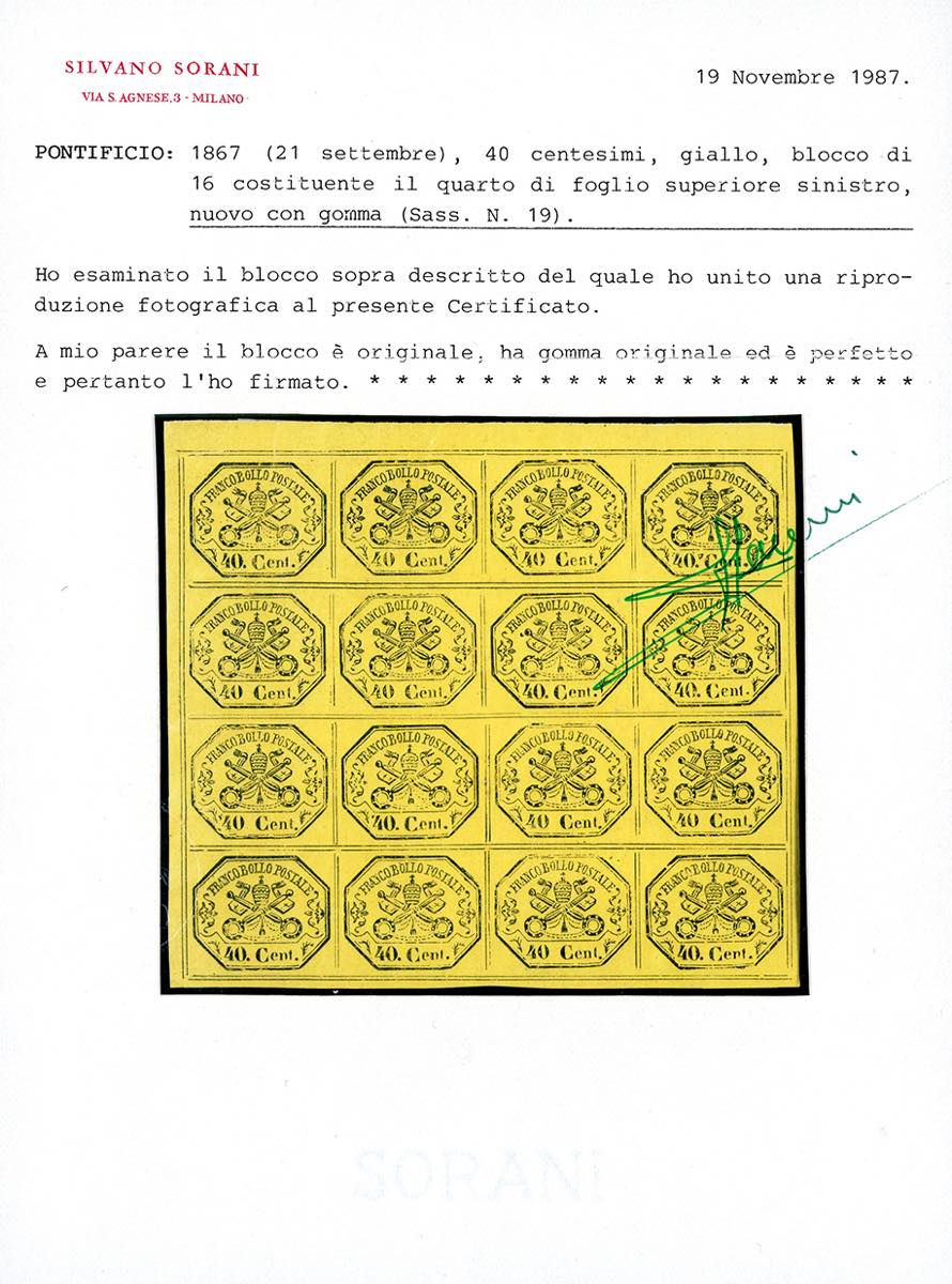 1861 - 40 cent. giallo (19), quarto di foglio superiore sinistro di 16 esemplari, gomma originale integra, solo 4 francobolli con traccia ... Read more