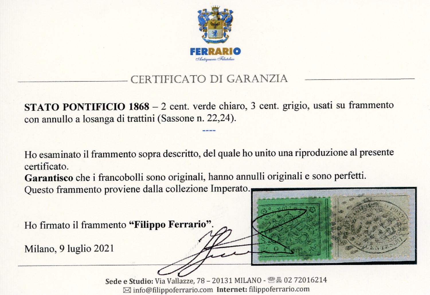 1868 - 3 cent. grigio, 2 cent. verde chiaro (24,22), perfetti, usati su frammento. Molto bello. Chiavarello. Ex coll. Imperato.