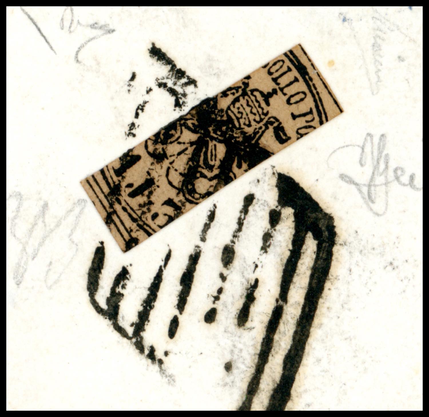 1859 - 3 baj bruno (4Aa), frazionato ad 1/3, sezione centrale, al verso di sovracoperta di lettera in porto assegnato per Bologna ... Read more