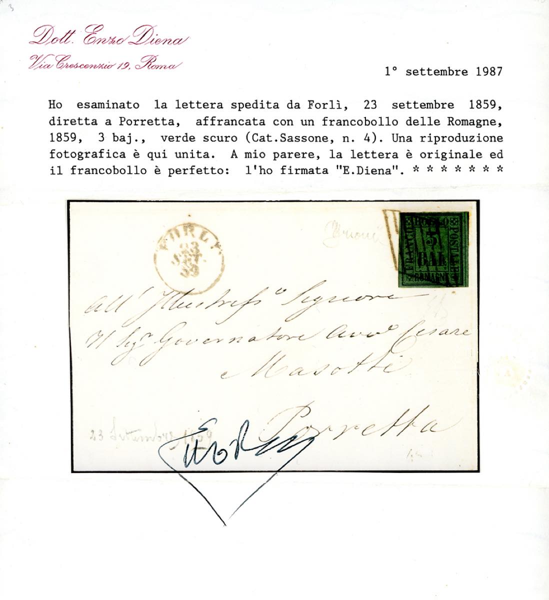 1859 - 3 baj verde scuro (4), perfetto, su fresca lettera da Forlì 23/9/1859 a Porretta. Primo mese d'uso, ottima qualità. Grioni, Raybaudi, Ferrario, cert. E.Diena.